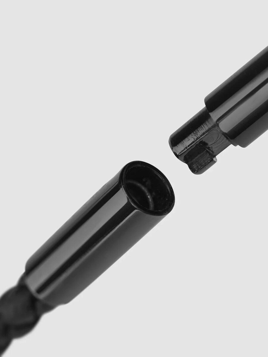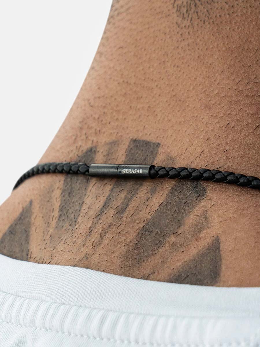 A sleek necklace featuring braided black leather and an elegant arrow pendant in polished stainless steel. It closes smoothly with a twist lock that stays secure without creating pressure points. The leather cord is also slim enough to add other pendants – perfect if you enjoy varying your style. A comfortable and timeless accessory for any occasion.
