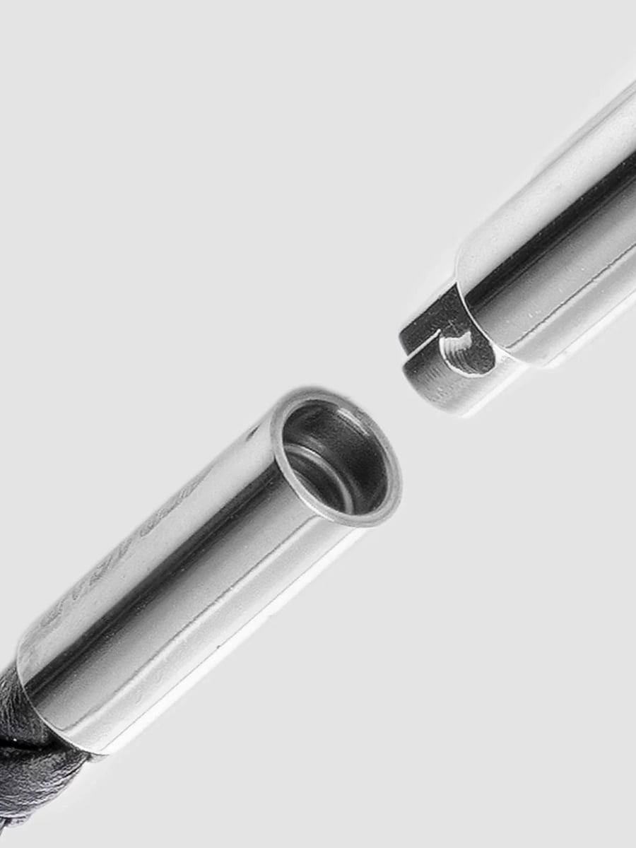 A sleek necklace featuring braided black leather and an elegant cross pendant in polished stainless steel. It closes smoothly with a twist lock that stays secure without creating pressure points. The leather cord is also slim enough for adding other pendants, making it perfect if you like to vary your style. A comfortable and timeless accessory for any occasion.