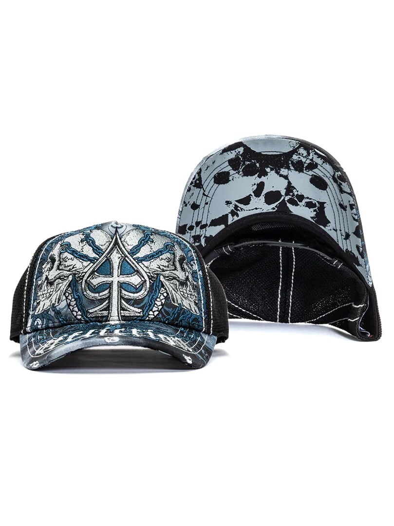 A trucker cap with a powerful and detailed look in Affliction’s signature style. The cap features twill on the front panels and visor, with mesh at the back for good ventilation. Distressed details on the front and brim combined with contrasting stitching create a raw, rock-inspired look. The snapback closure at the back provides an adjustable and comfortable fit for everyday wear.