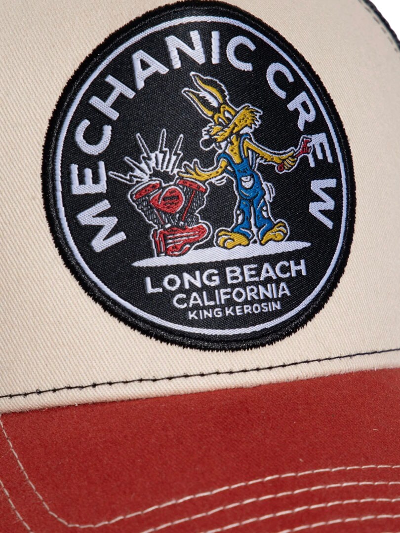 Stylish cap with a red brim and black mesh back. The front features a large, detailed patch showing two wild mechanic figures in action that really grabs attention. Designed with a snapback closure and a curved brim.