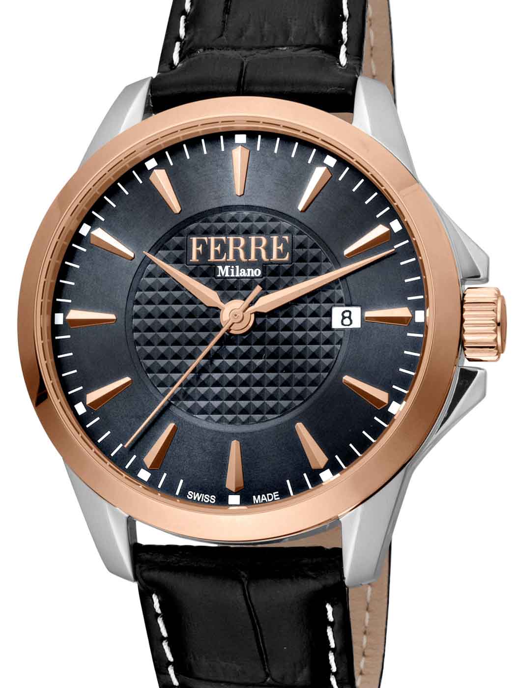 Watch with stainless steel case and reptile patterned leather strap. The dial is equipped with a date display and is protected by a scratch-resistant mineral glass. Water resistant up to 100 metres.