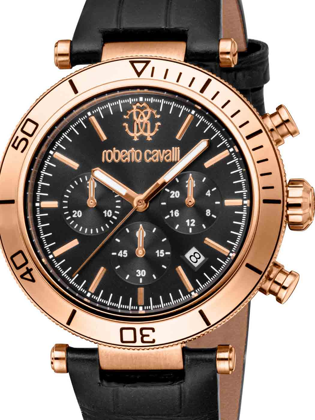 Black watch with rose gold coloured steel. Chronograph function, date display and three subdials provide technical precision. The black leather strap in a reptile-embossed design enhances the sense of class and elegance. Water resistant up to 100 metres.