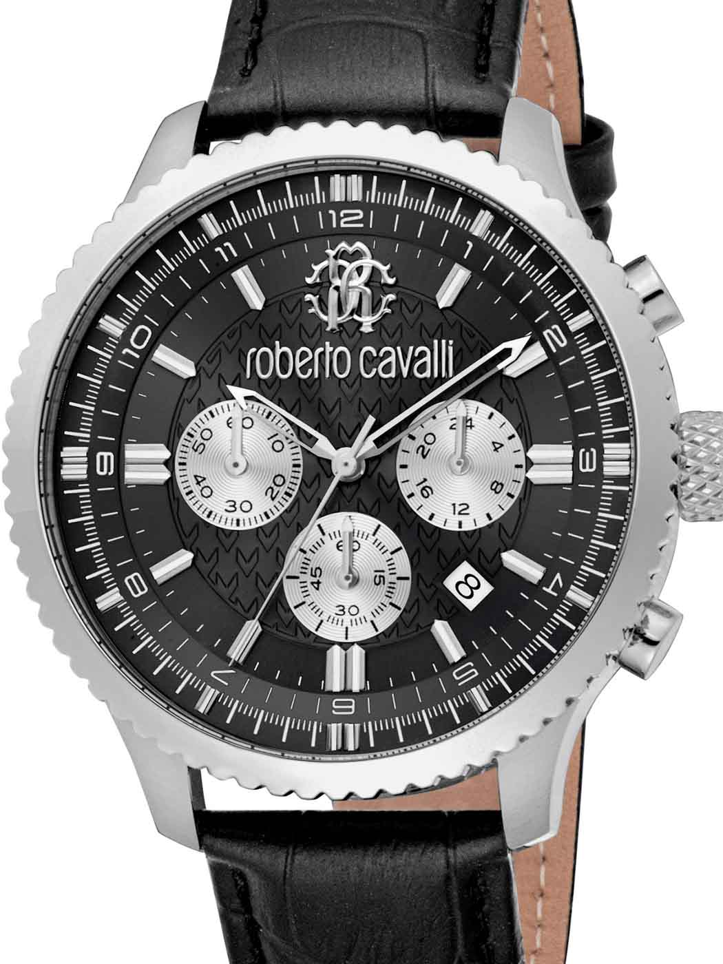This elegant watch features a precise quartz movement, chronograph and stopwatch. The black leather strap, embossed with a reptile design, adds to the sense of class and elegance. Water resistant to 100 metres.