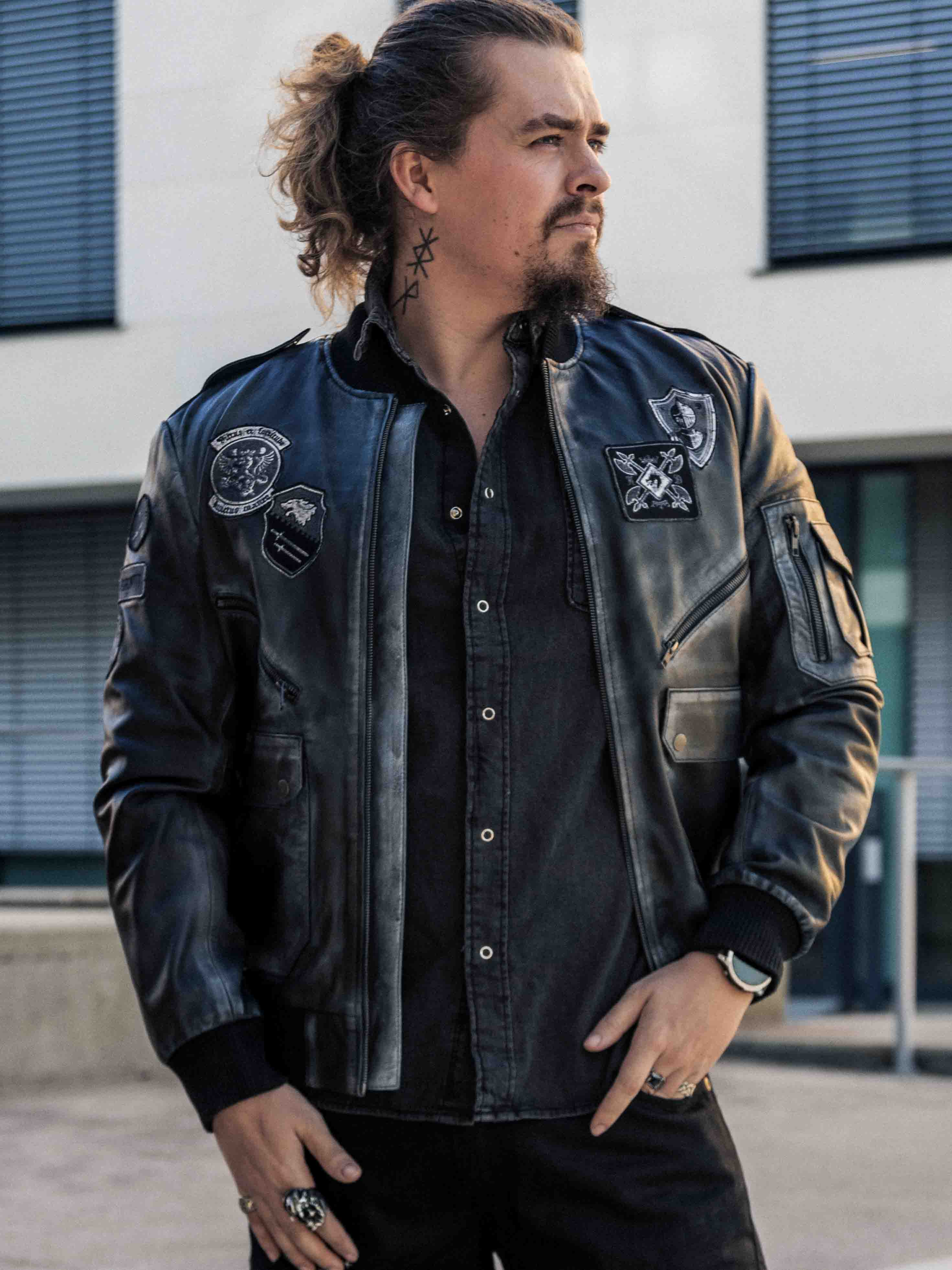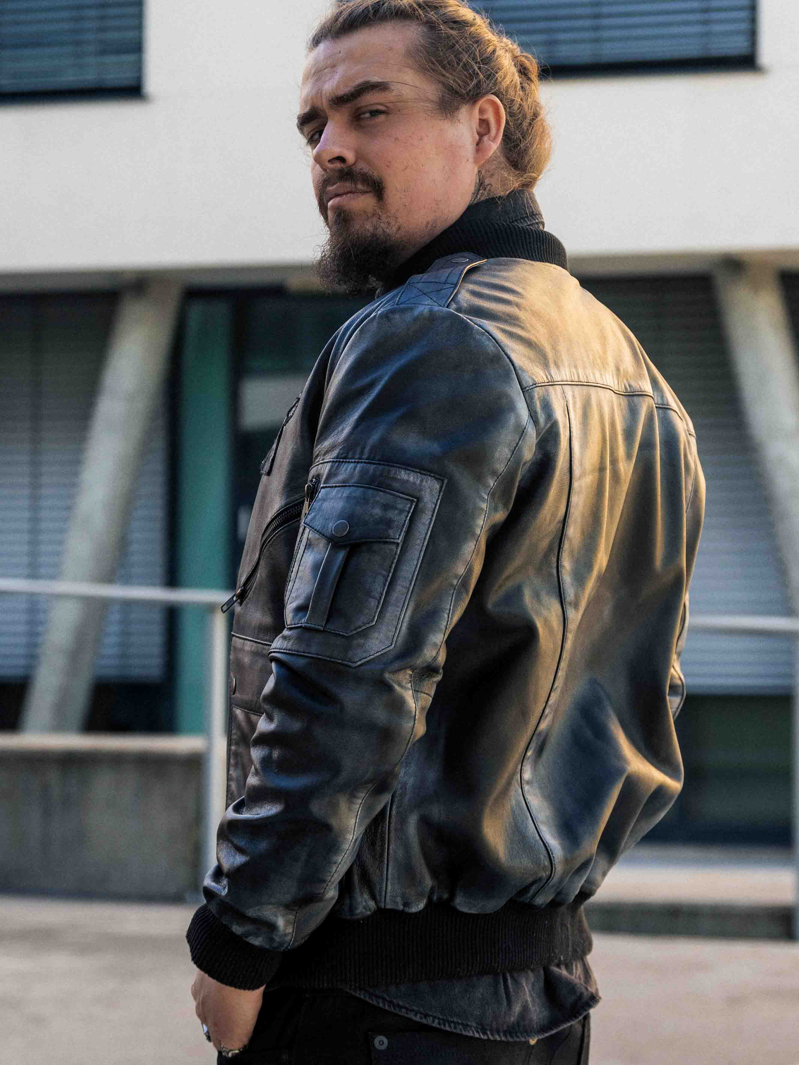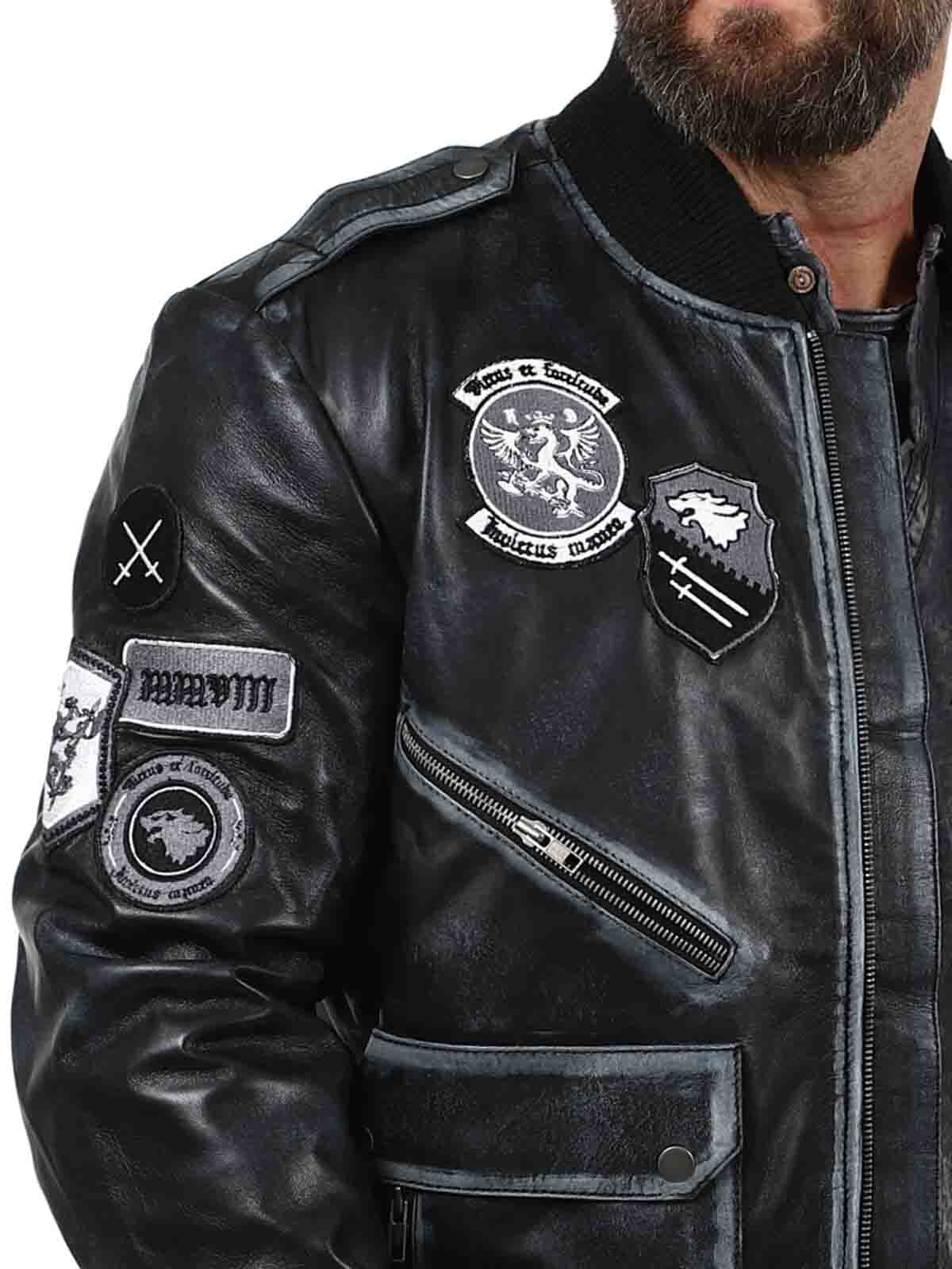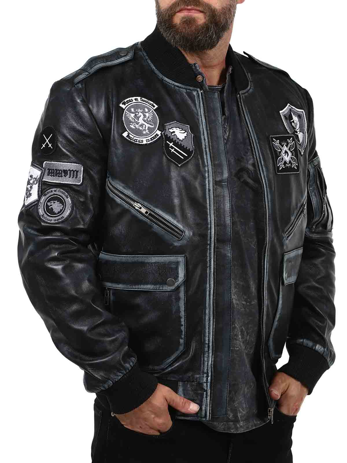 A retro-inspired jacket in a sleek vintage black shade, featuring decorative patches. Made from soft, supple high-quality leather with ribbed trims for an optimal fit. It includes multiple closable pockets that offer both practical function and stylish design. A signature piece created by our own team!