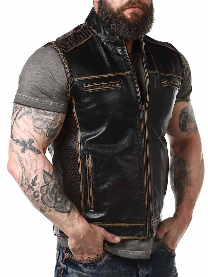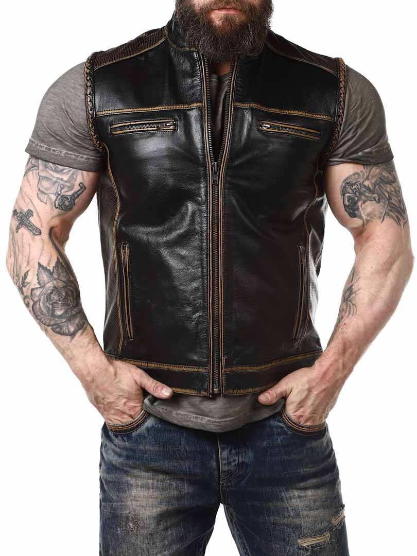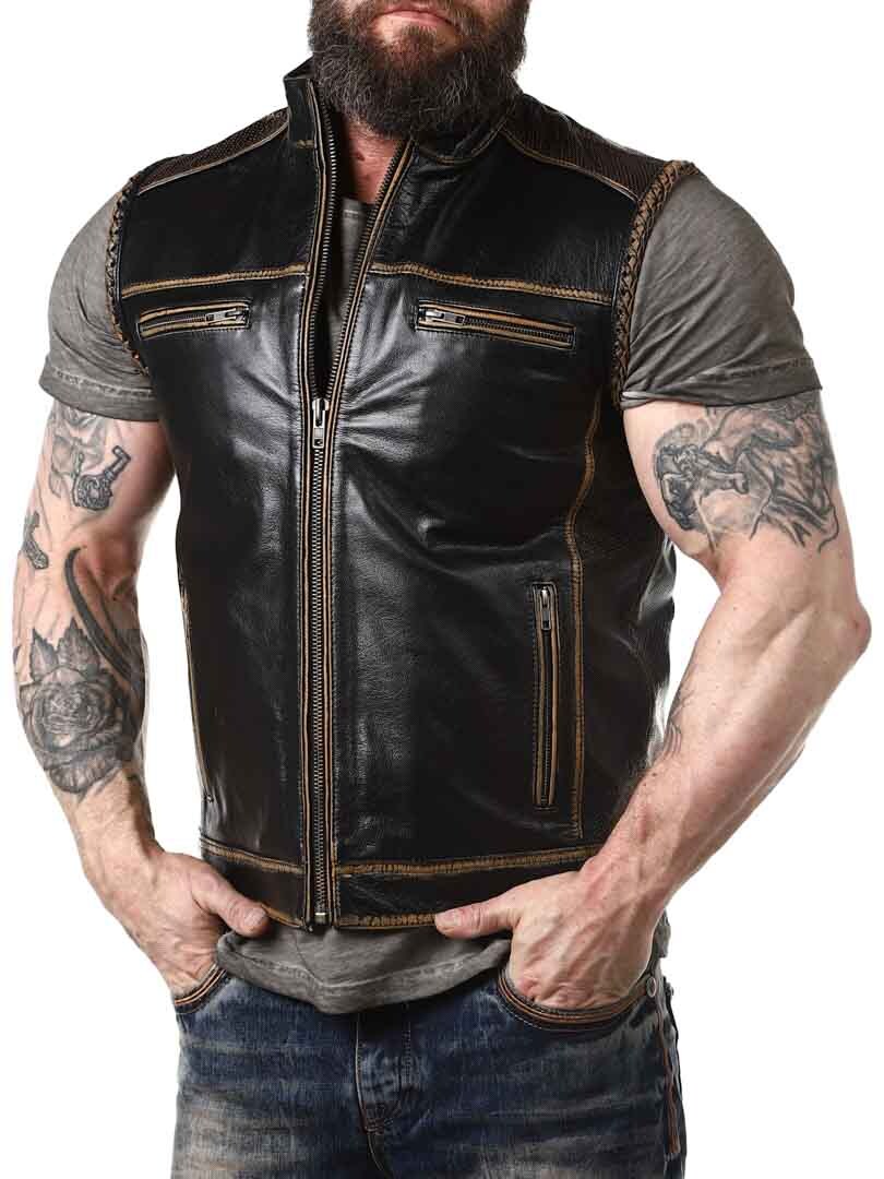 Vest made of genuine leather with lighter sections and braided leather decoration, giving it a stylish vintage look. It features four front zip pockets and two inner pockets. The vest closes with a sturdy zipper and is designed with a collar and padded back section. Available exclusively at RockDenim!