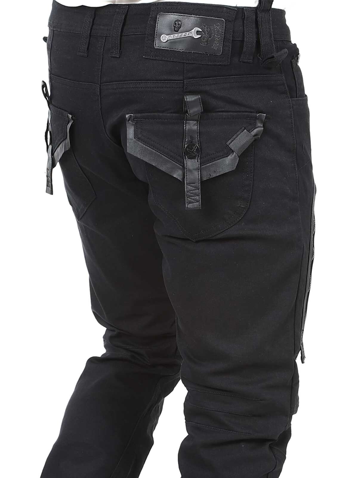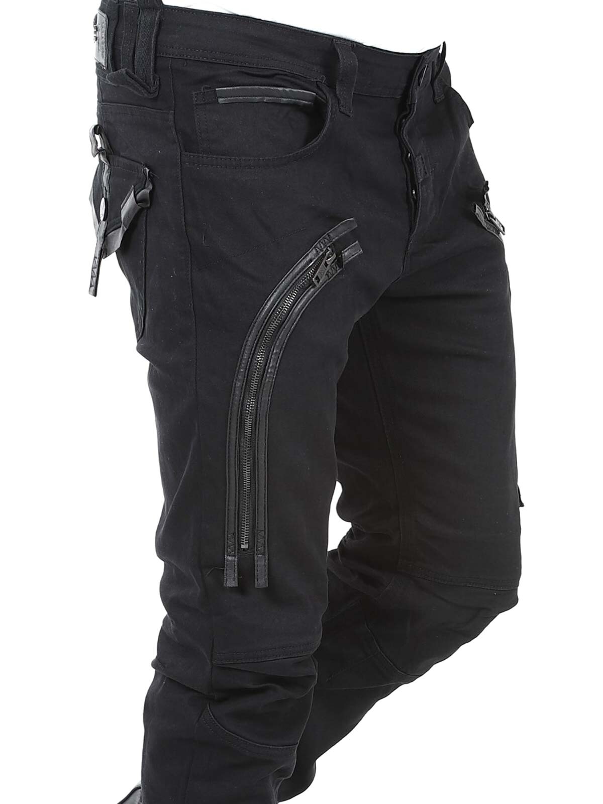 Black jeans with stretch and a slim fit. They have three open front pockets, two closable pockets and buttons on the fly. Designed with drawstrings and faux leather straps.