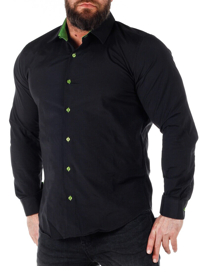 A comfortable cotton shirt with a slim fit and a bit of stretch. Black base with buttons, contrasting color on the inside of the collar and cuffs. The shirt features a slimmer cut with a rounded hem and a reinforced collar to maintain its shape. Available in more colors!