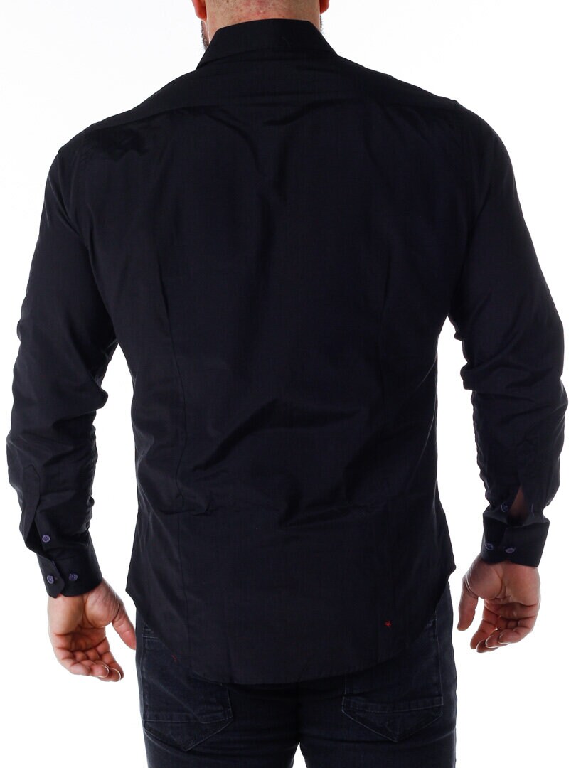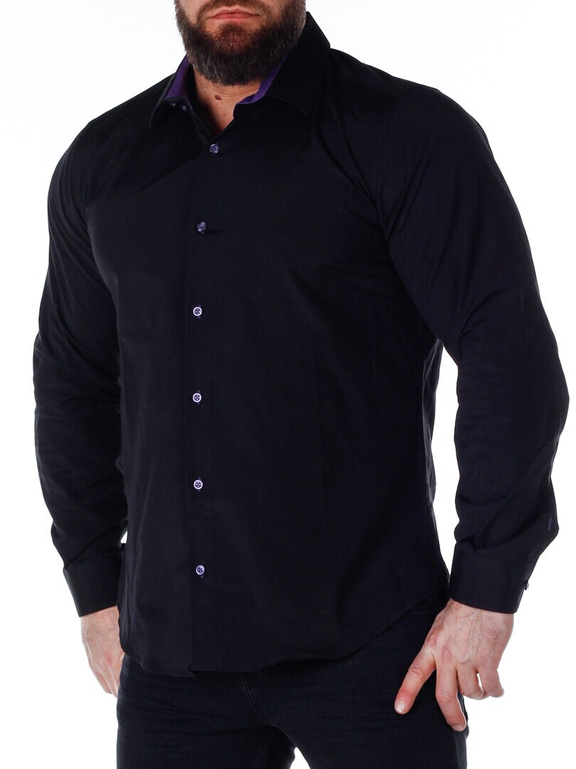 A comfortable cotton shirt with a slim fit and a bit of stretch. Features a black base with buttons, contrasting color on the inside of the collar and cuffs. The shirt has a slimmer cut with a rounded hem and a reinforced collar to maintain its shape. Available in more colors!