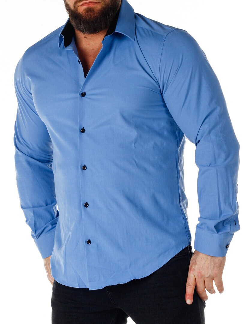 Cotton shirt in a comfortable, slightly stretchy model. Blue base with buttons, contrast color on the inside of the collar and cuffs. Slim fit with a rounded hem and a reinforced collar that retains its shape. Available in more colors!