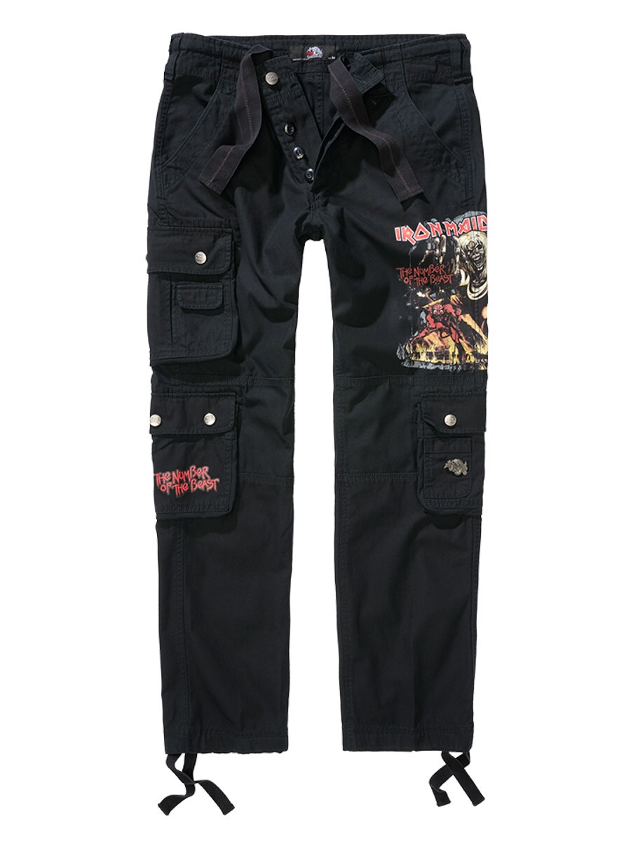 Black slim-fit trousers made from durable, skin-friendly cotton that provides both comfort and strength. Adjustable fabric straps at the waist and cuffs make it easy to customize the fit. Designed with a large Iron Maiden print along the left leg and a “Number of the Beast” print on the right leg pocket — a clear tribute to the iconic heavy metal band Iron Maiden.
