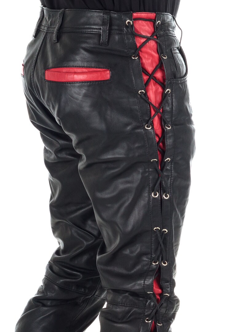 Genuine leather trousers with thin lining and drawstring at the sides to adjust the width. They have three front pockets, two back pockets and waist loops. Zip closure with metal button.