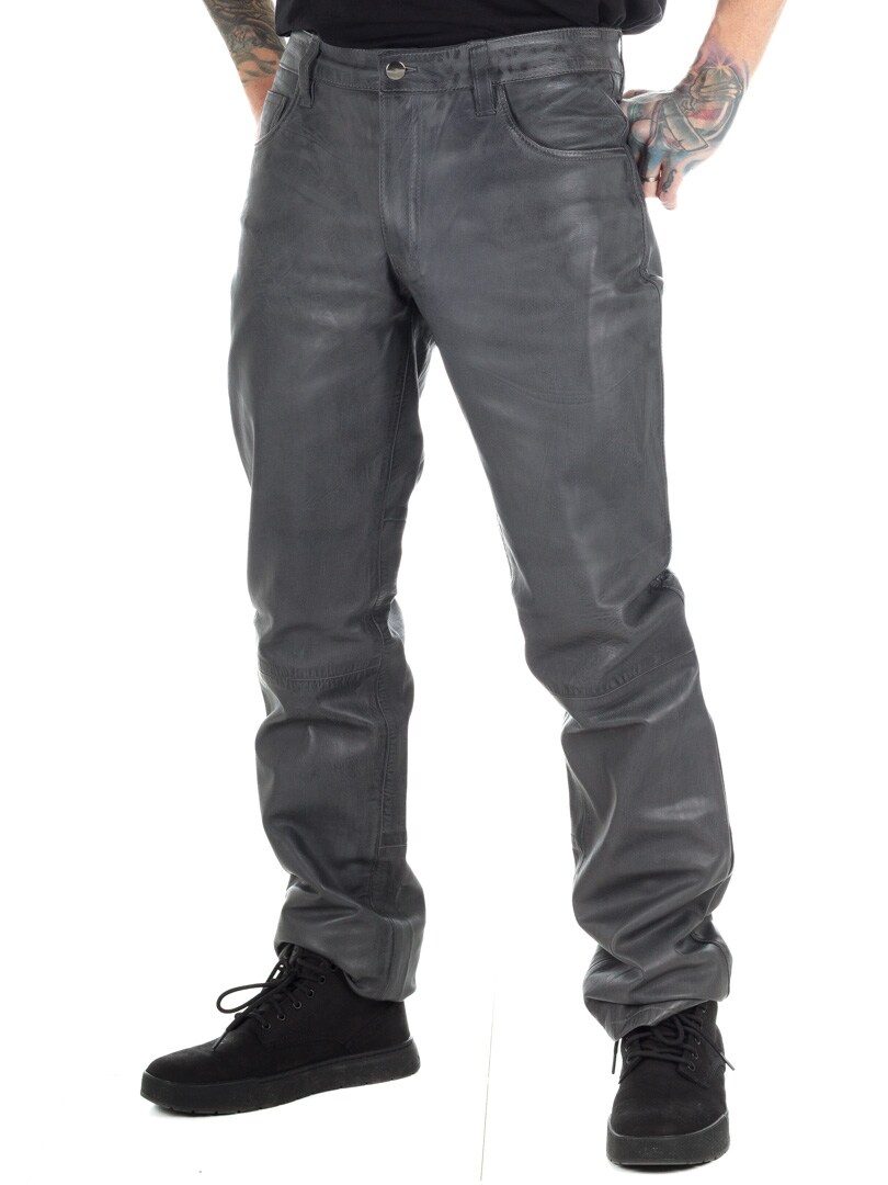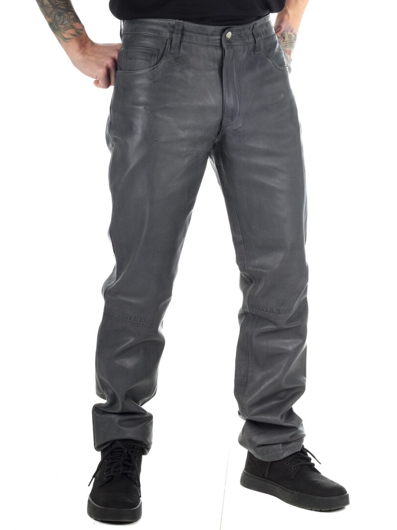 Grey genuine leather trousers with classic 5-pocket design. Made from soft leather with a polyester lining for a comfortable fit. If you want a comfortable pair of pants with attitude, you've come to the right place!