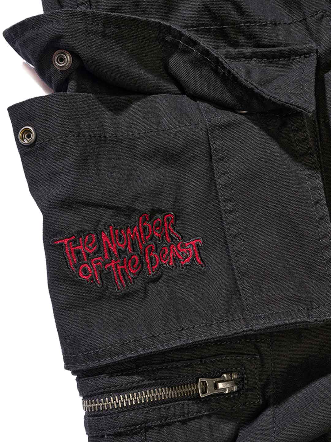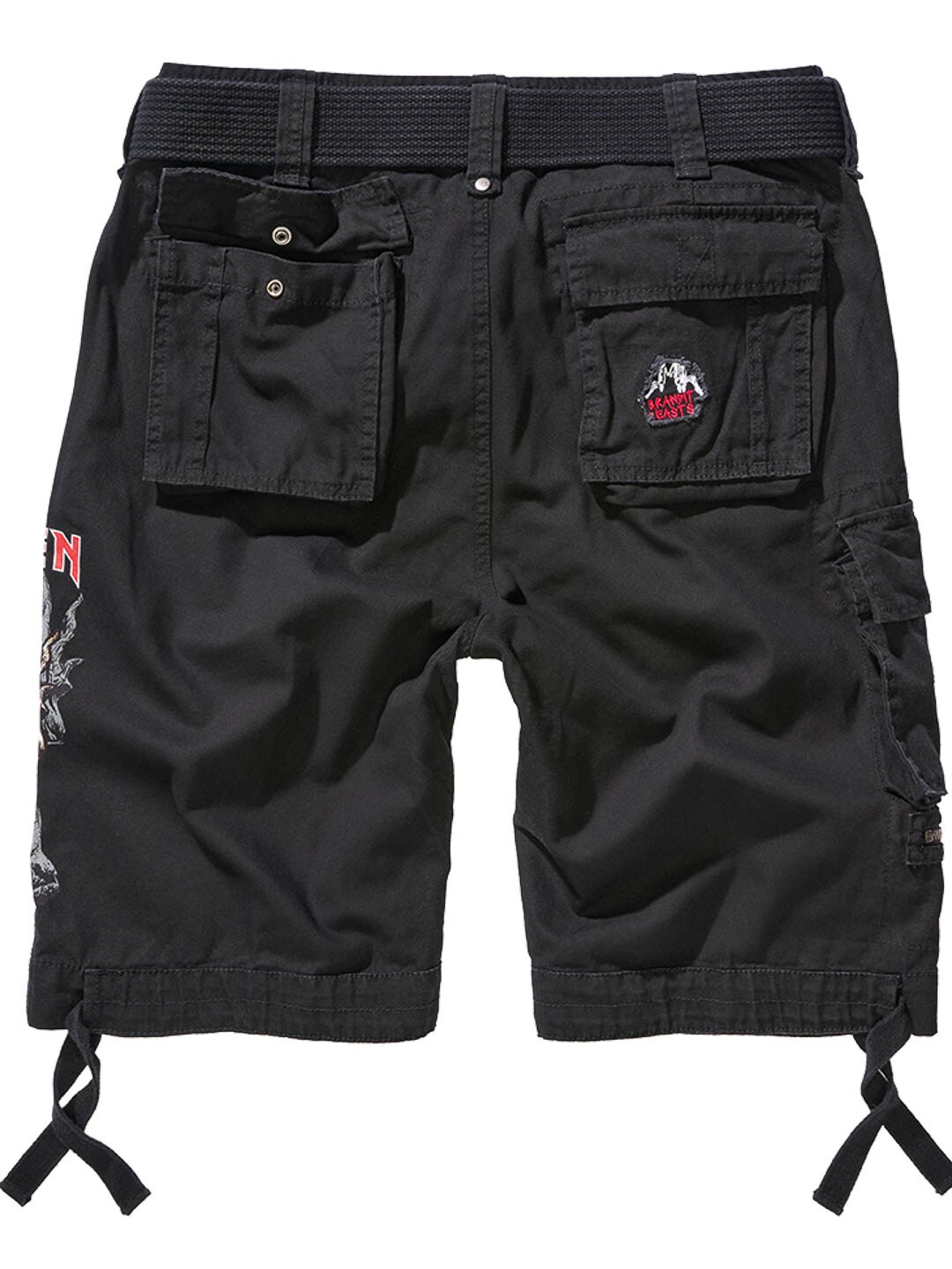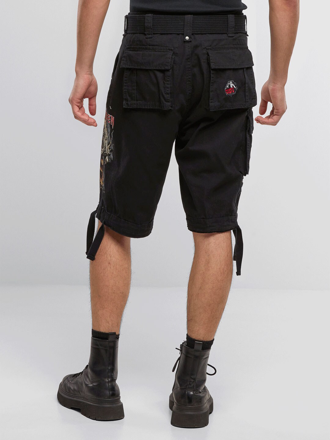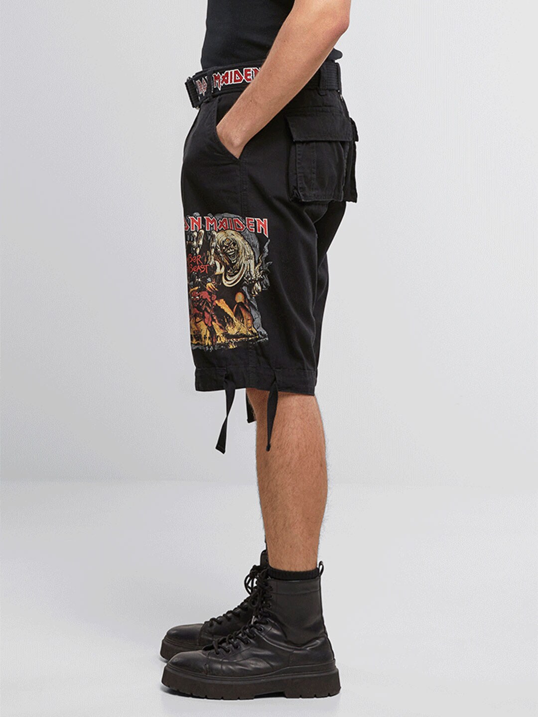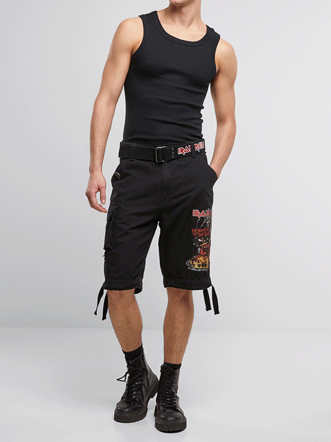 Tough cargo shorts for fans of Iron Maiden and classic rock style. These shorts combine a robust, military-inspired design with iconic details from the album "The Number Of The Beast". They feature several practical pockets as well as adjustable fabric straps at the waist and leg openings, making it easy to adjust the fit for optimal comfort.