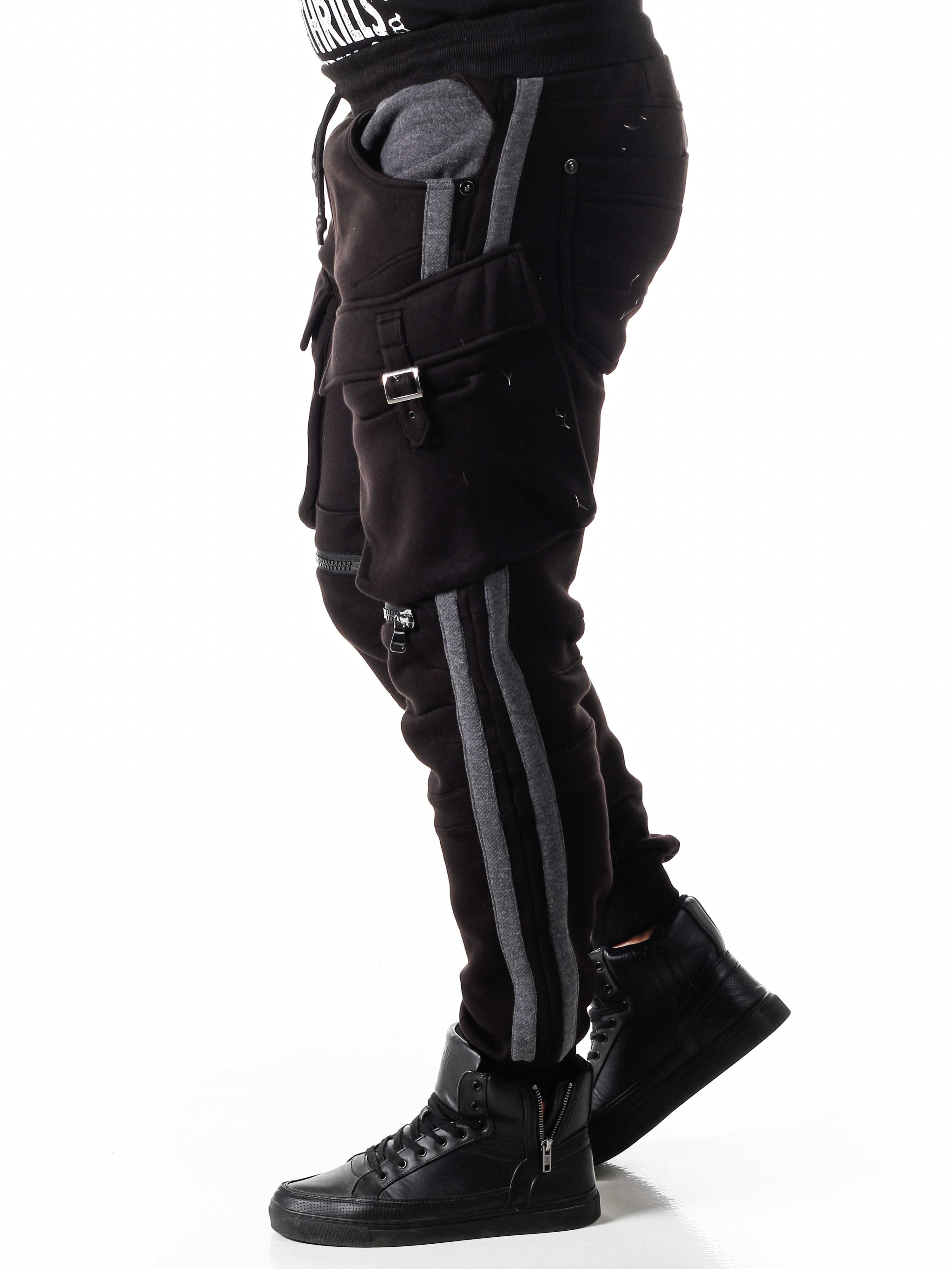 Relaxed-fit pants with contrasting stripes. Two front pockets, two back pockets, and two leg pockets. Detailed with zippers on the knees.