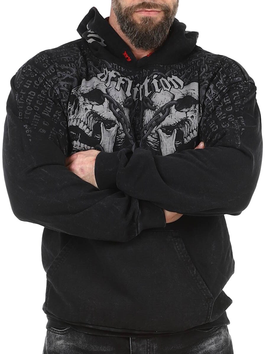 A powerful hoodie with attitude and striking details. The black, washed base is combined with large gothic-style graphics. Features a classic kangaroo pocket and ribbed cuffs. Perfect for anyone who loves a dark, rock-inspired look!