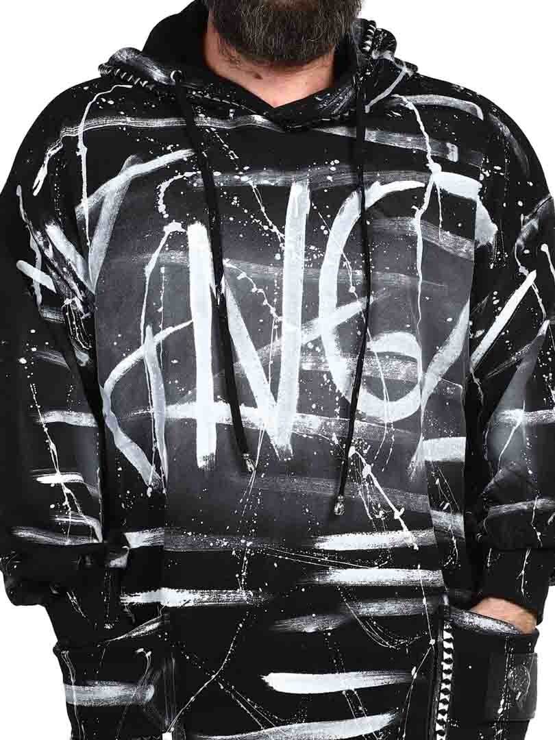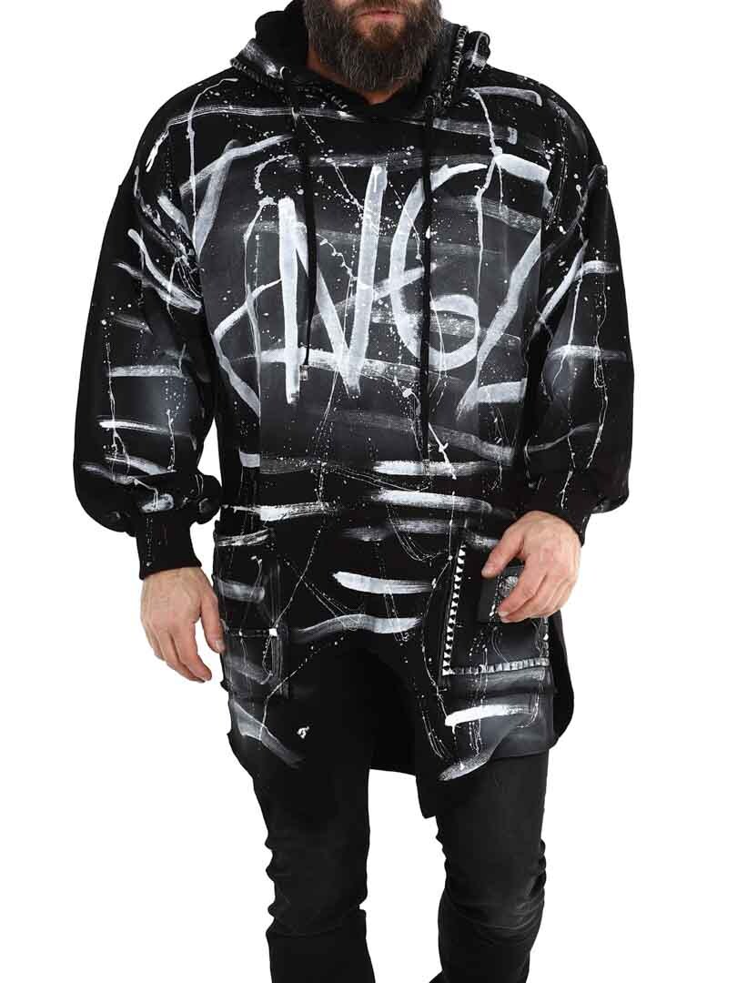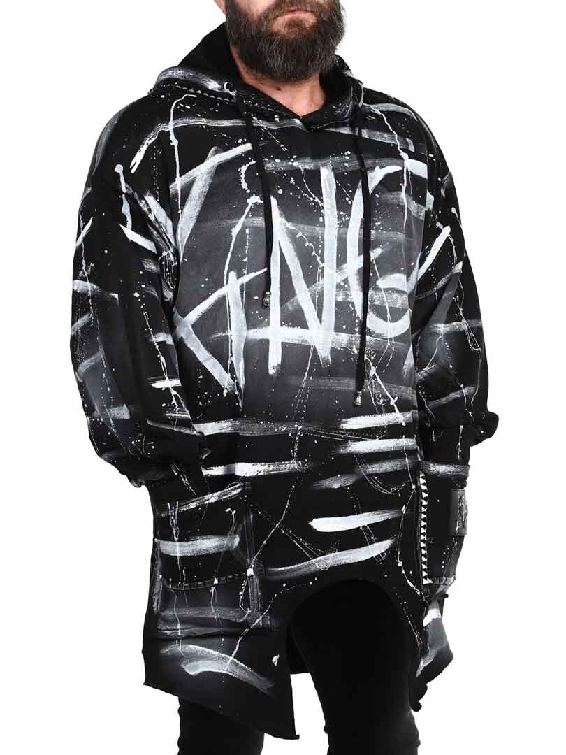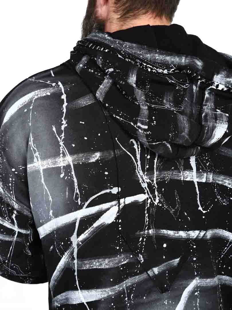 Hoodie in a longer style with cutout at the bottom. Detailed with black studs, patch and embroidered logo on the back. It has a drawstring hood and two open front pockets.