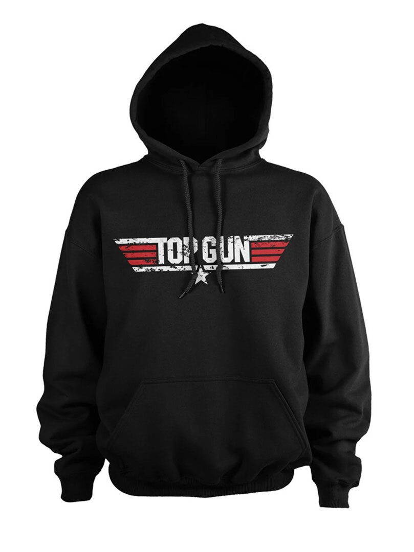 This black hoodie with a Top Gun design is a must-have for all fans of classic action movies and iconic 80s style. It features a drawstring hood, a kangaroo pocket, and ribbed cuffs and hem.