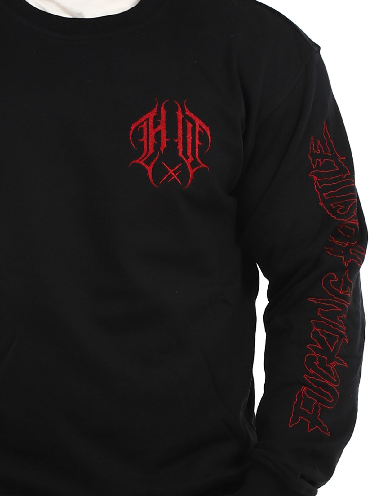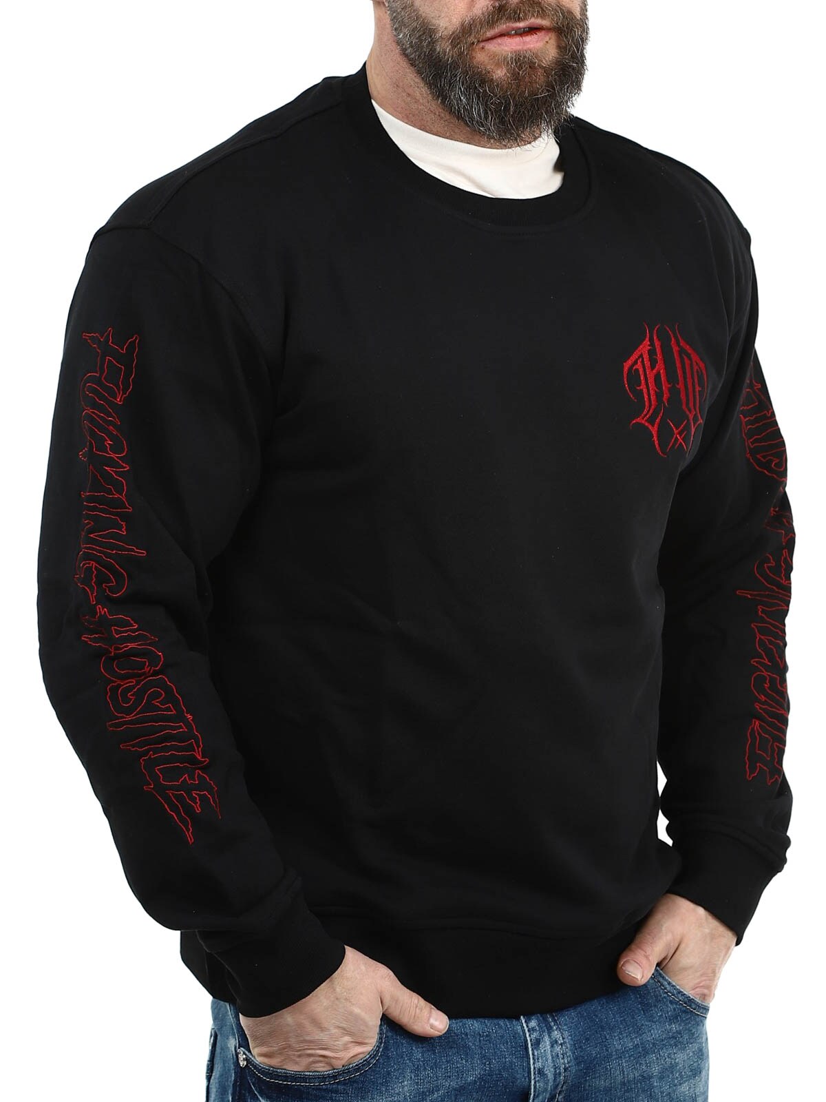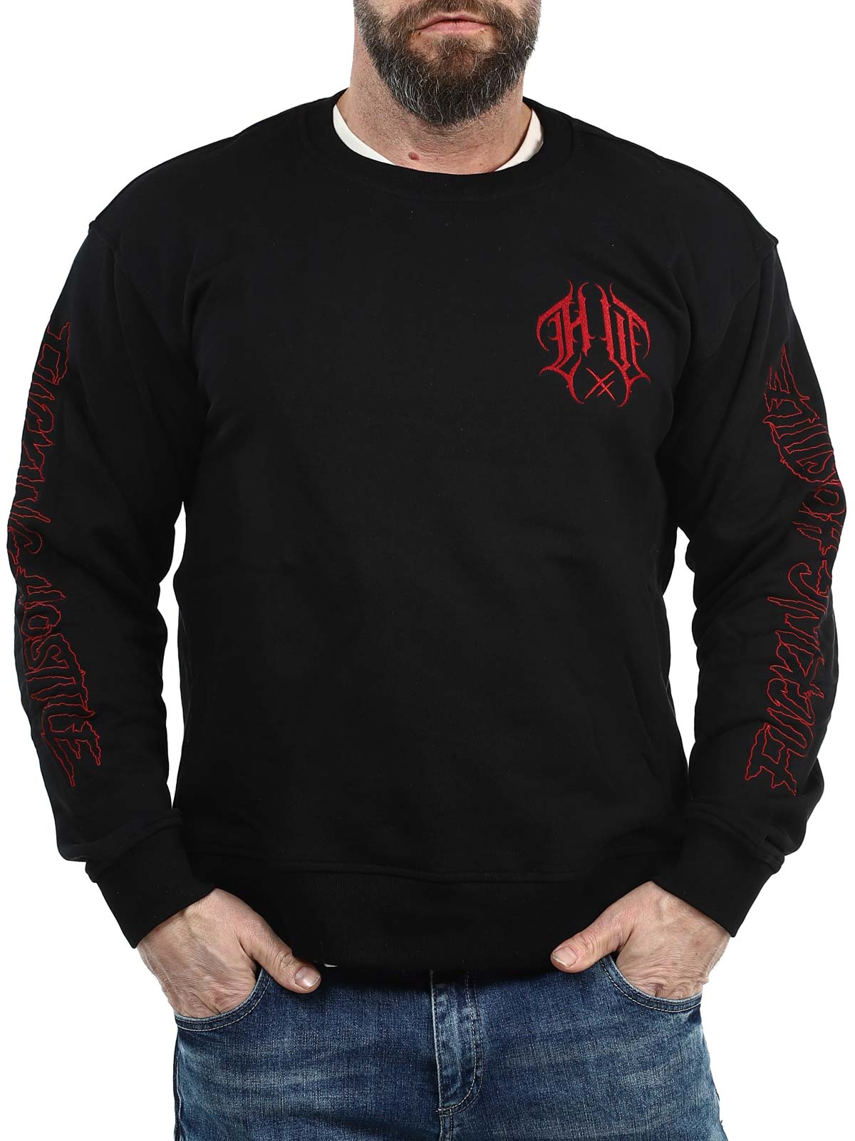 Black sweatshirt designed with red embroidered prints on the chest, back and sleeves. It features a round neckline and ribbed cuffs. A cool sweatshirt that works equally well for everyday wear or a more alternative streetwear look.