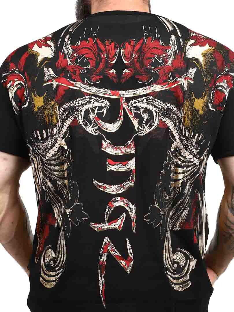 T-shirt with a bold and expressive design, perfect for those who want to make a strong impression. Featuring a detailed print that mixes skulls, snakes and dynamic patterns in red, gold and black, the shirt gives a rebellious and artistic feel. Made from stretch cotton with a v-neck opening. An obvious choice for those who want a unique look with attitude!