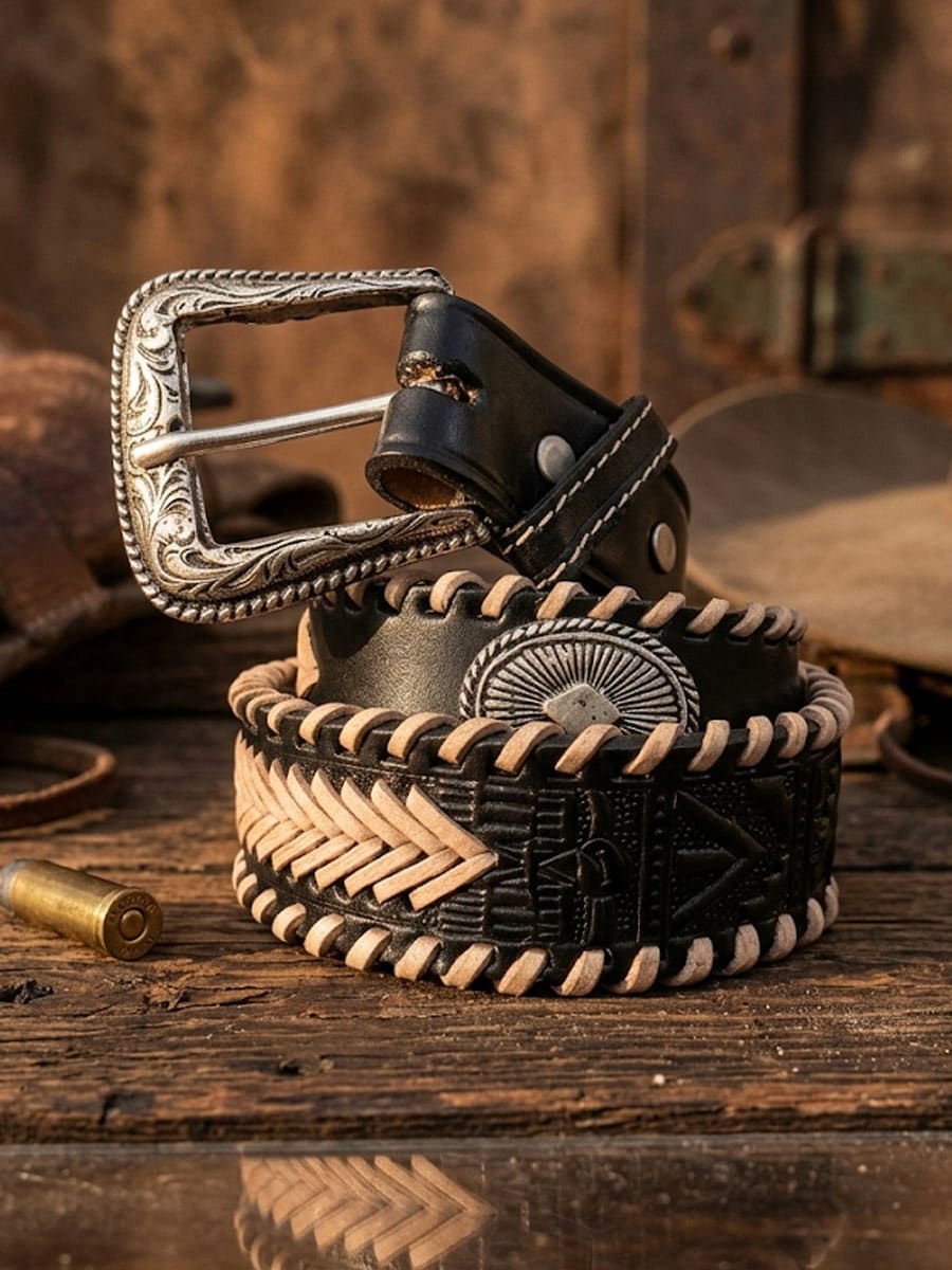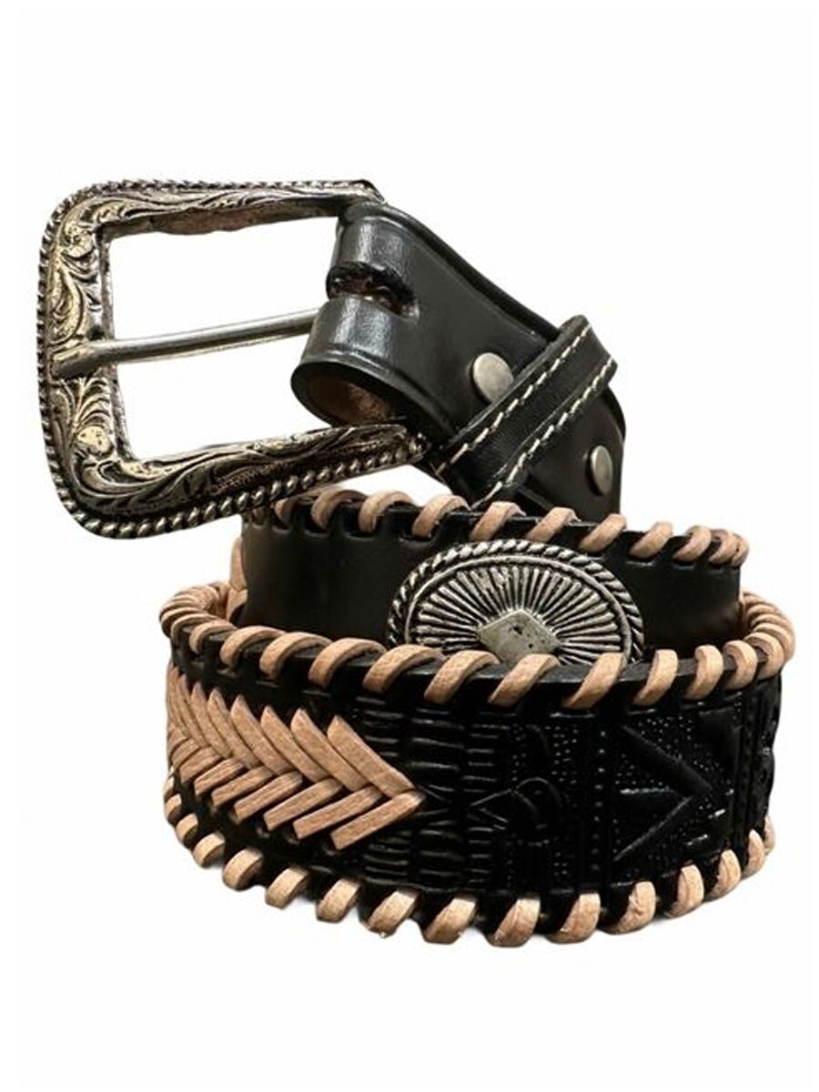 Et karakterfuldt bælte i kraftigt kolæder med flettede kanter, dekorative metalldetaljer og prægede elementer, der giver en tydelig westernstil. Det stilfulde spænde er udskifteligt, hvilket gør bæltet nemt at kombinere med næsten alle typer bæltespænder.