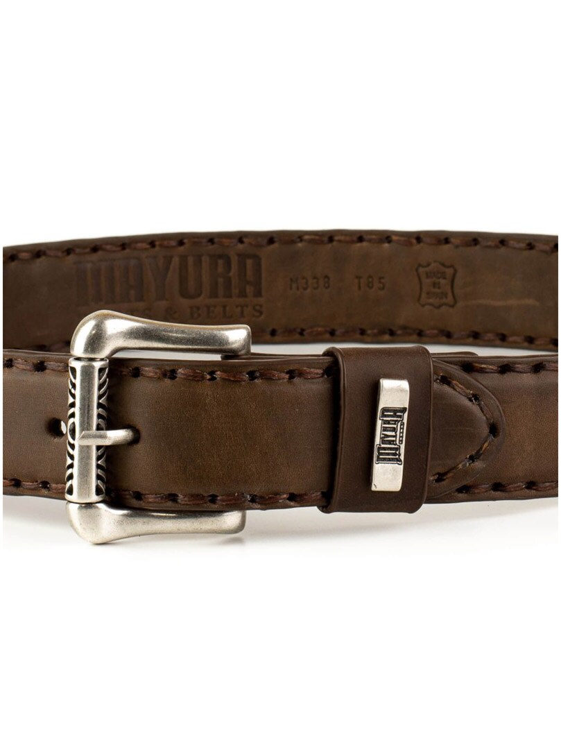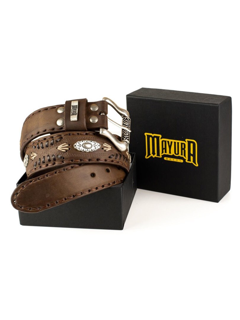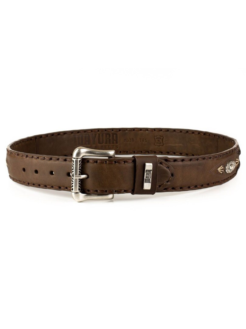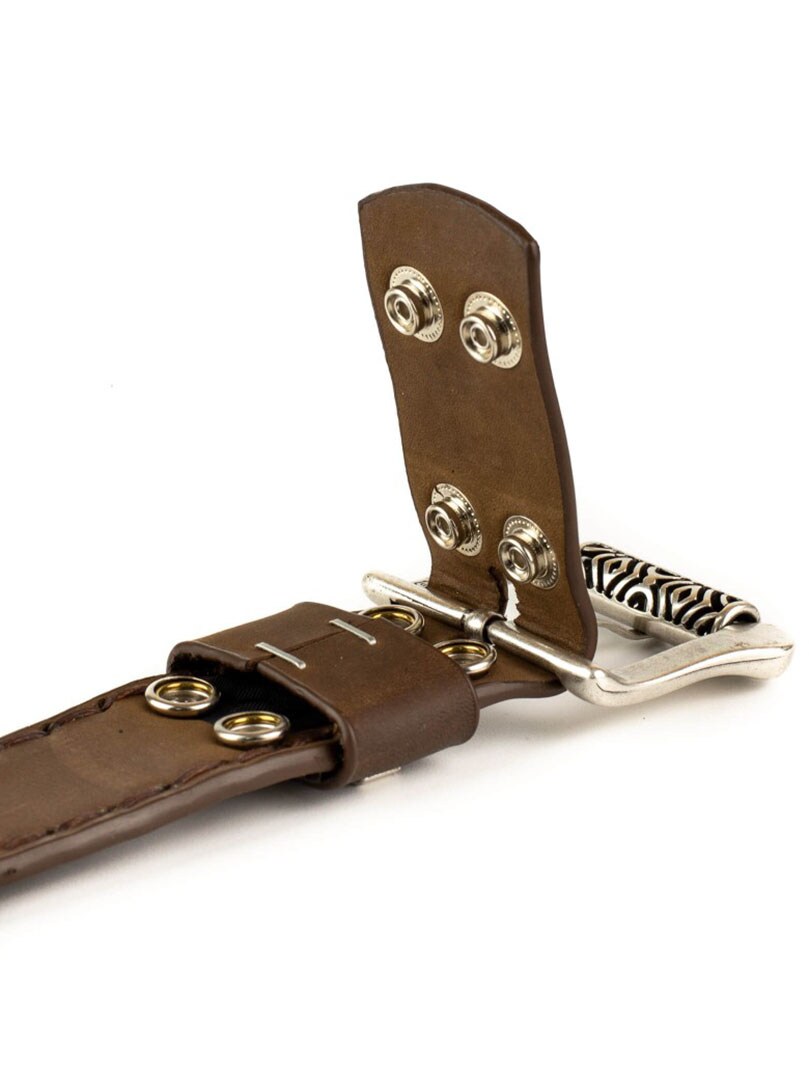 Et kraftfuldt og stilfuldt bælte med tydelig westernkarakter. Fremstillet i robust brun læder og dekoreret med prægede mønstre samt antikfarvede metaldele, der giver et markant og eksklusivt udtryk. Et perfekt accessory til dig, der vil give dit outfit et personligt og råt edge!