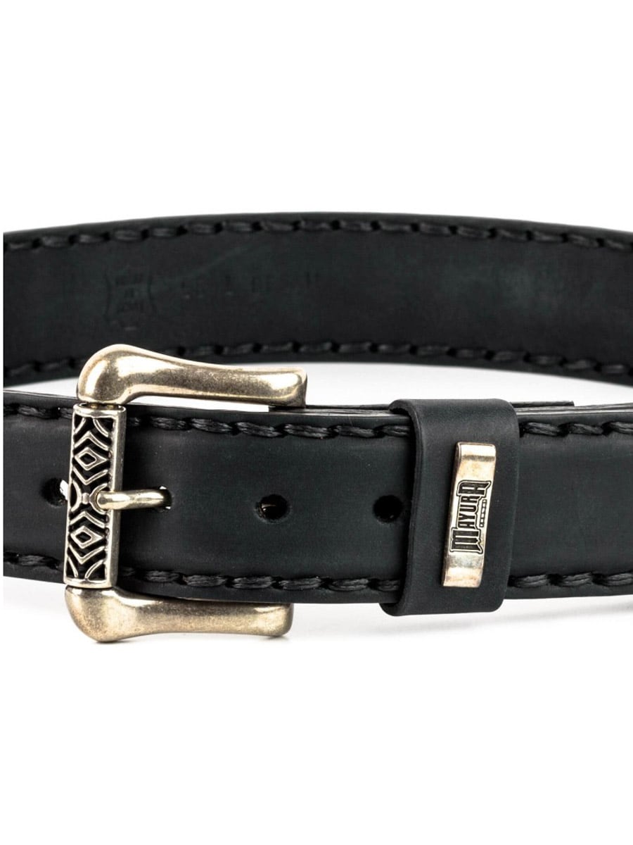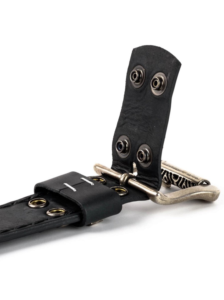 Et kraftfuldt og stilfuldt bælte med tydelig westernkarakter. Fremstillet i robust sort læder og dekoreret med prægede mønstre samt antikfarvede metaldele, der giver et markant og eksklusivt udtryk. Et perfekt accessory til dig, der vil give dit outfit et personligt og råt edge!