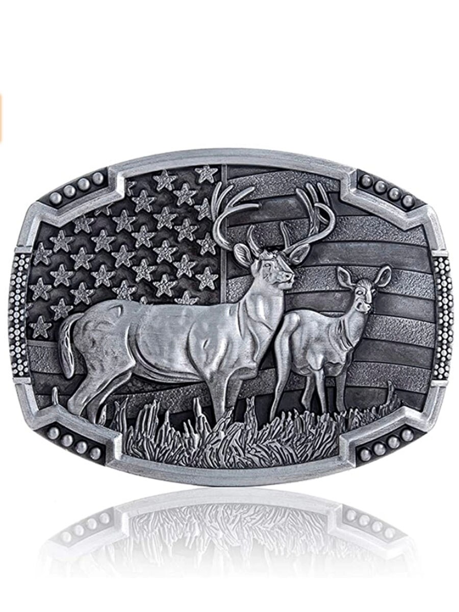 Bæltespænde med hjortemotiv og amerikansk flag.