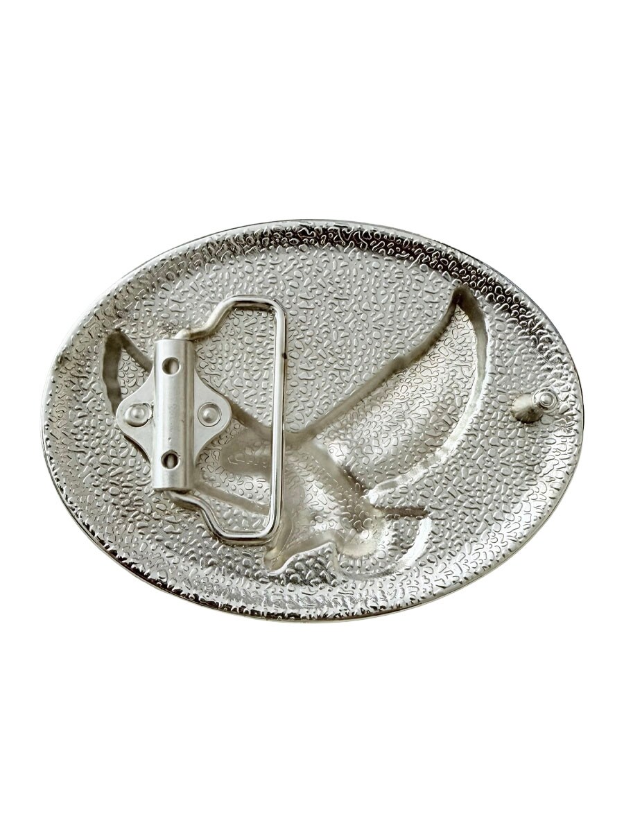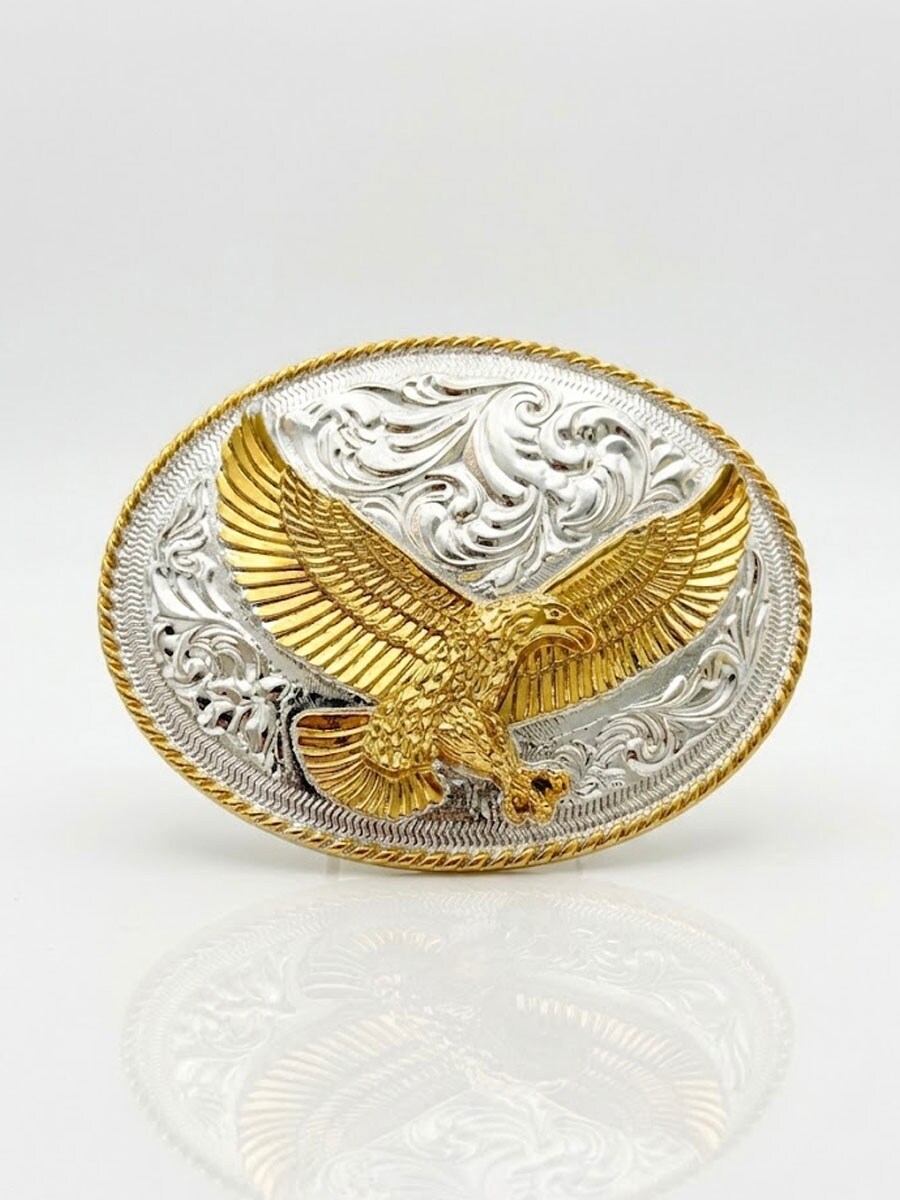 Et elegant bæltespænde med ørn-motiv og graveret baggrund. Den ovale form og den dekorative ramme giver en tydelig westernfølelse, der virkelig skiller sig ud. Spændet passer til bælter, der er op til 4 cm brede, hvilket gør det nemt at kombinere med de fleste standardbælter med udskiftelige spænder.