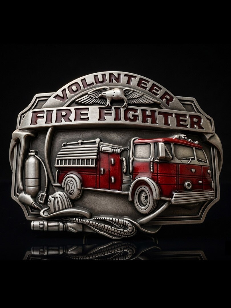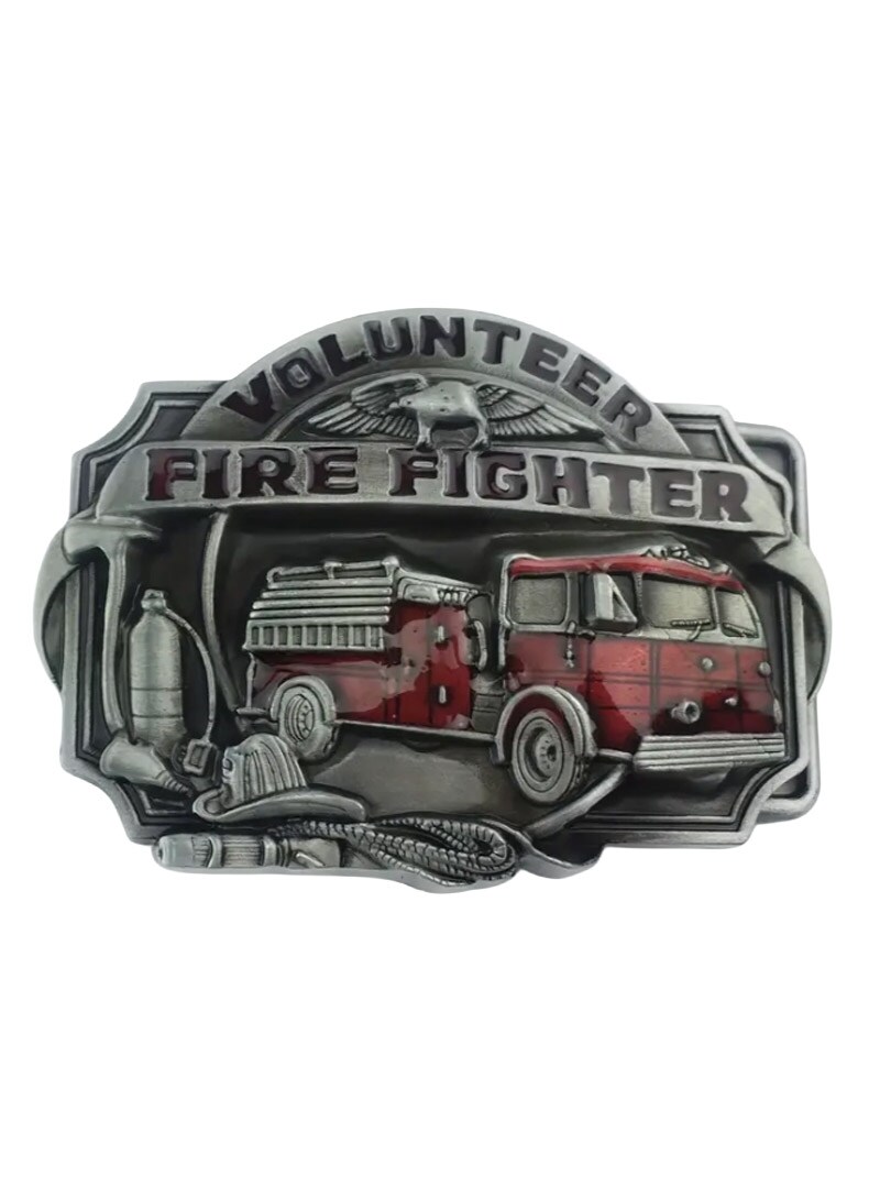 Detaljeret bæltespænde med en rød brandbil og teksten “Volunteer Fire Fighter”. Spændet passer til bælter op til 4 cm i bredden, hvilket gør det nemt at kombinere med de fleste standardbælter med udskiftelige spænder.