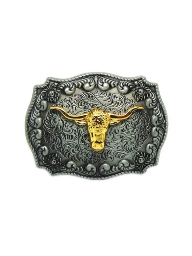 Detaljeret bæltespænde i antik finish med en forhøjet, guldbelagt longhorn-applikation, der giver et stærkt og eksklusivt udtryk. Spændet passer til bælter op til 4 cm i bredden, hvilket gør det nemt at kombinere med de fleste standardbælter med udskiftelige spænder.