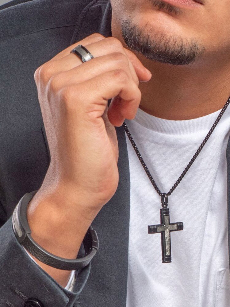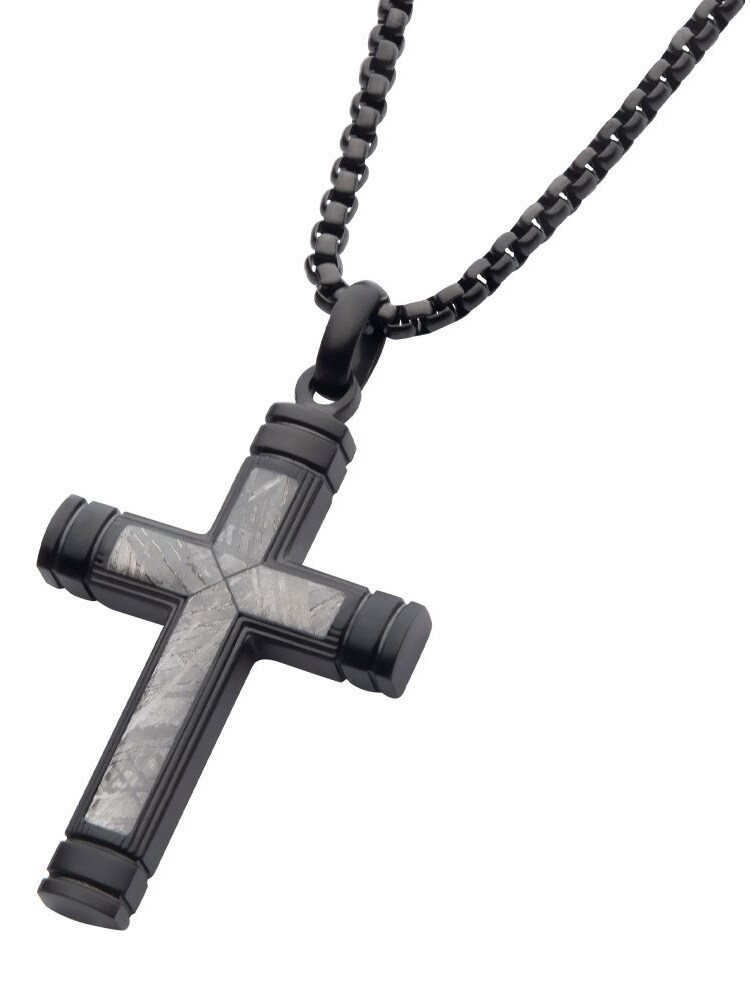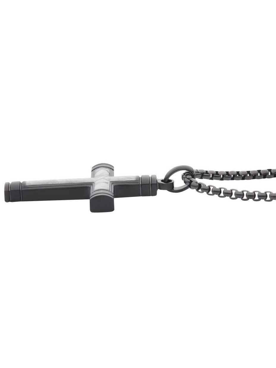 Halskæde med en sort IP-belægning og et vedhæng med en meteoritinlægning. Fremstillet af rustfrit stål.