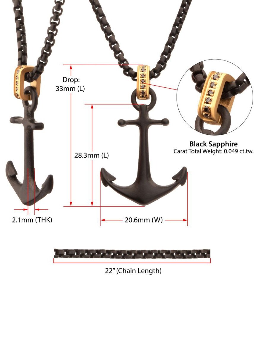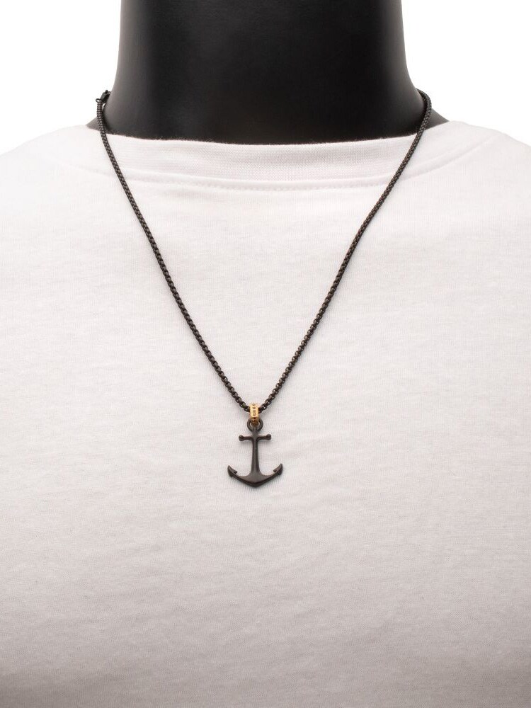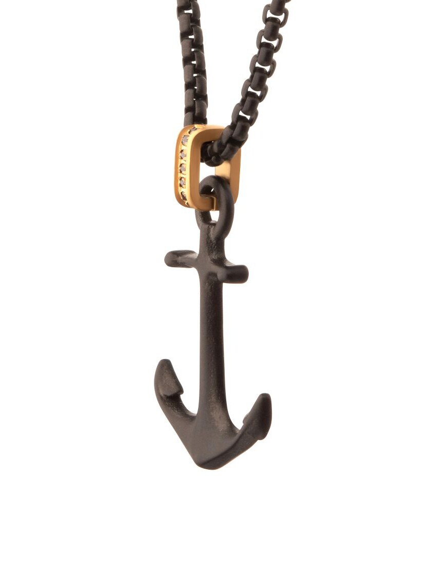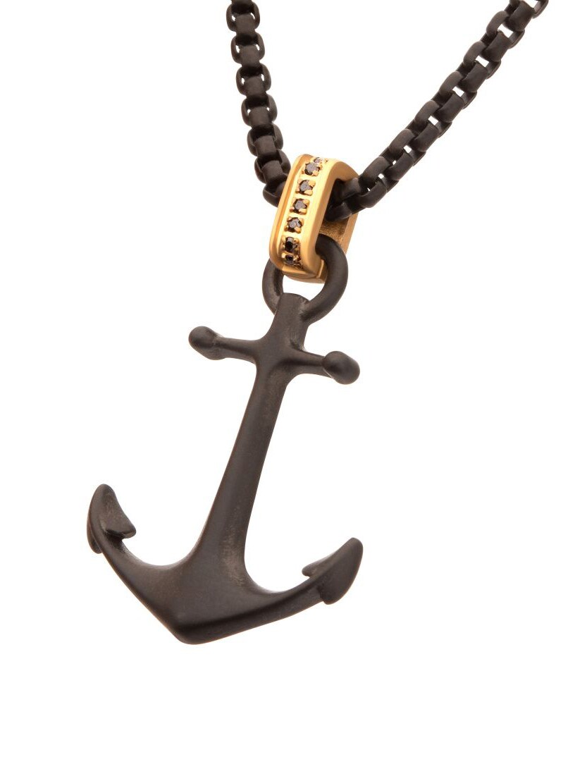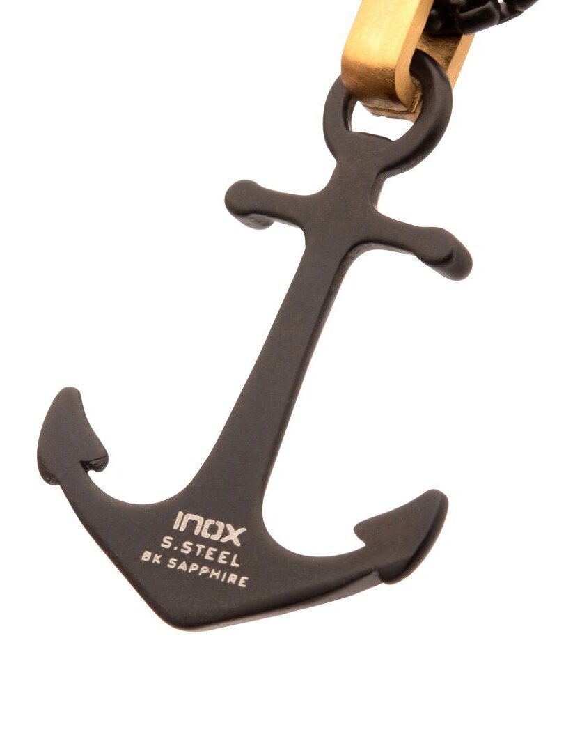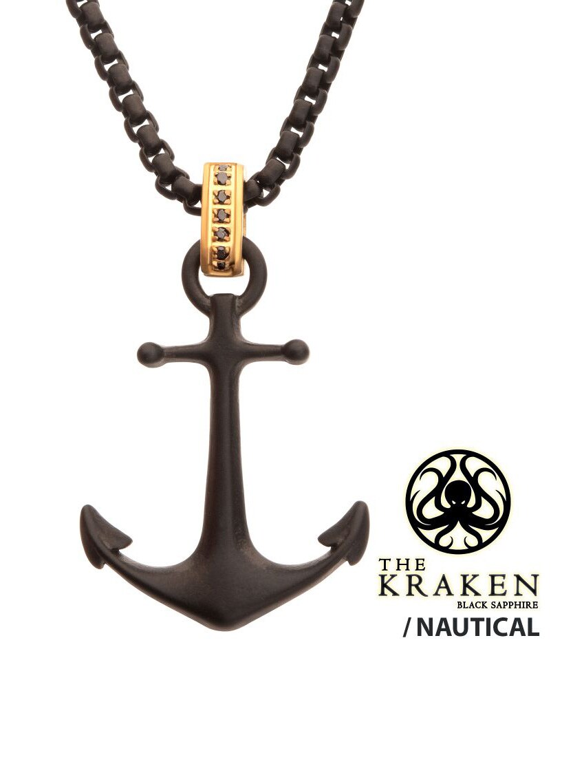 Halskæde med kæde og vedhæng i sort IP-stål med en mat finish. Kraken-anker med et gyldent glimt af sort safir i løkken. Fremstillet af rustfrit stål.