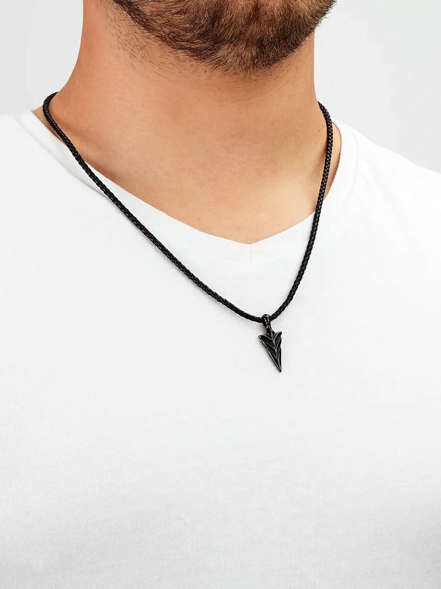 En stilren halskæde med flettet sort læder og et elegant pilvedhæng i poleret rustfrit stål. Den lukkes nemt med en twist-lås, som sidder sikkert uden at skabe trykpunkter. Lædersnoren er desuden smal nok til, at du kan tilføje andre vedhæng – perfekt hvis du gerne vil variere din stil. Et behageligt og tidløst accessory til alle lejligheder.