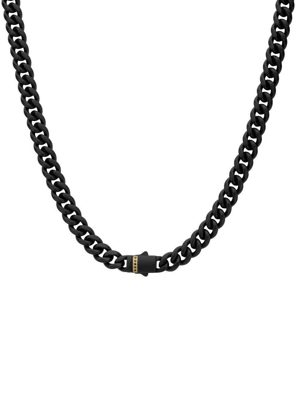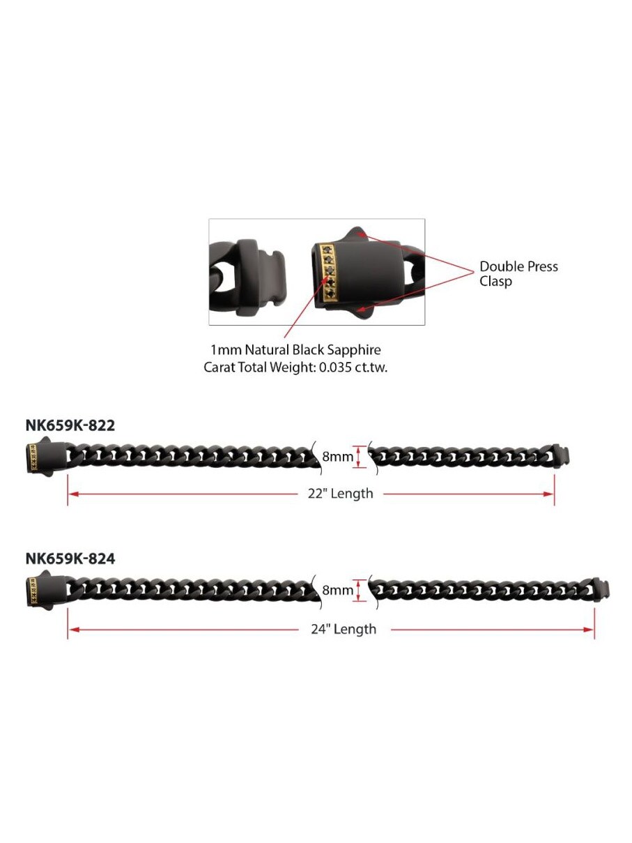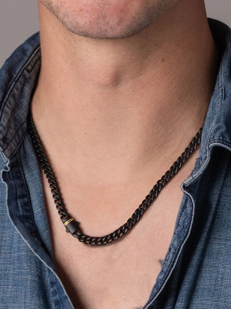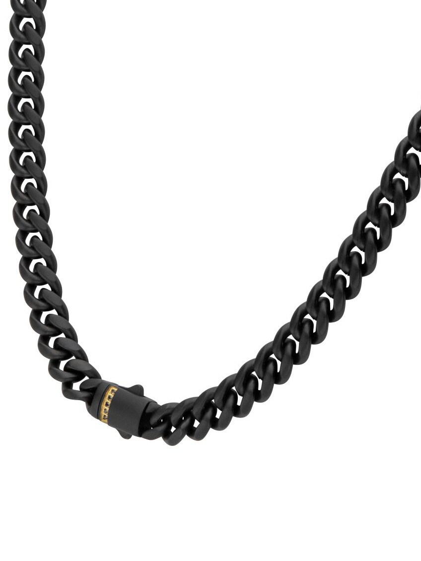 Cubansk kæde fra Inox med en sort IP-belægning og mat finish. Låsen er prydet med sorte safir sten, indfattet i en eksklusiv 18K forgyldt dobbelt foldelås, som giver både sikkerhed og en luksuriøs detalje.