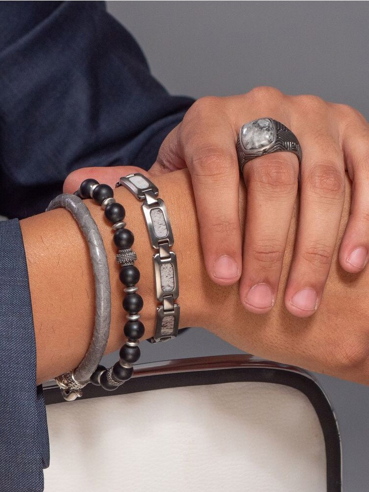 Armbånd med 8 mm. matsorte agatsten kombineret med sorte oxiderede metalperler. Designet med stræktråd for en let påtagning og perfekt pasform.