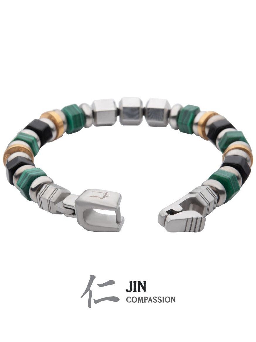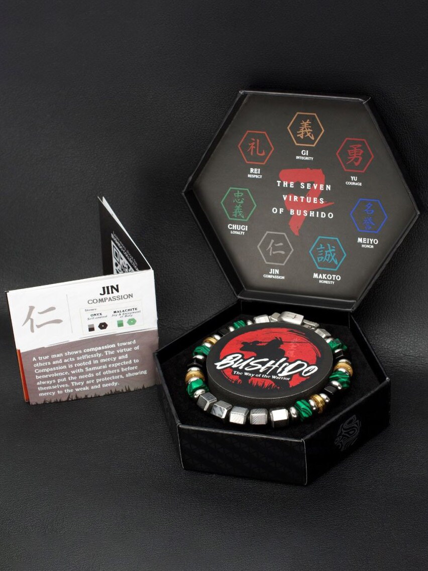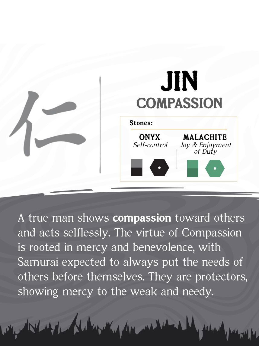 JIN: COMPASSION – En sand mand udviser medfølelse over for andre og handler uselvisk. Dyden medfølelse har sin rod i nåde og velvilje, hvor samuraier forventes altid at sætte andres behov før deres egne. De er beskyttere, der viser barmhjertighed over for de svage og trængende.