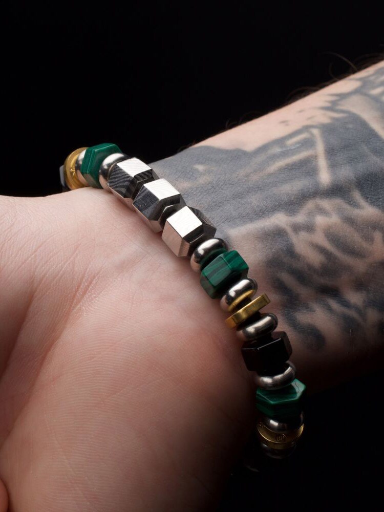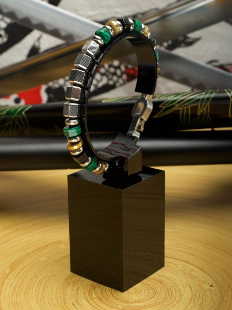 Et eksklusivt armbånd inspireret af den japanske Bushido-tradition. Armbåndet kombinerer den traditionelle teknik Mokume Gane – en unik metallkunst, der skaber mønstre, som minder om træårer – med smukke ædelstene.