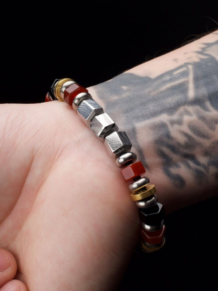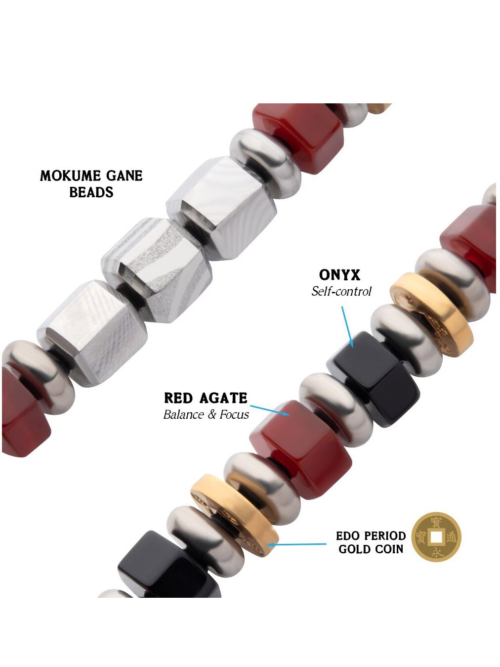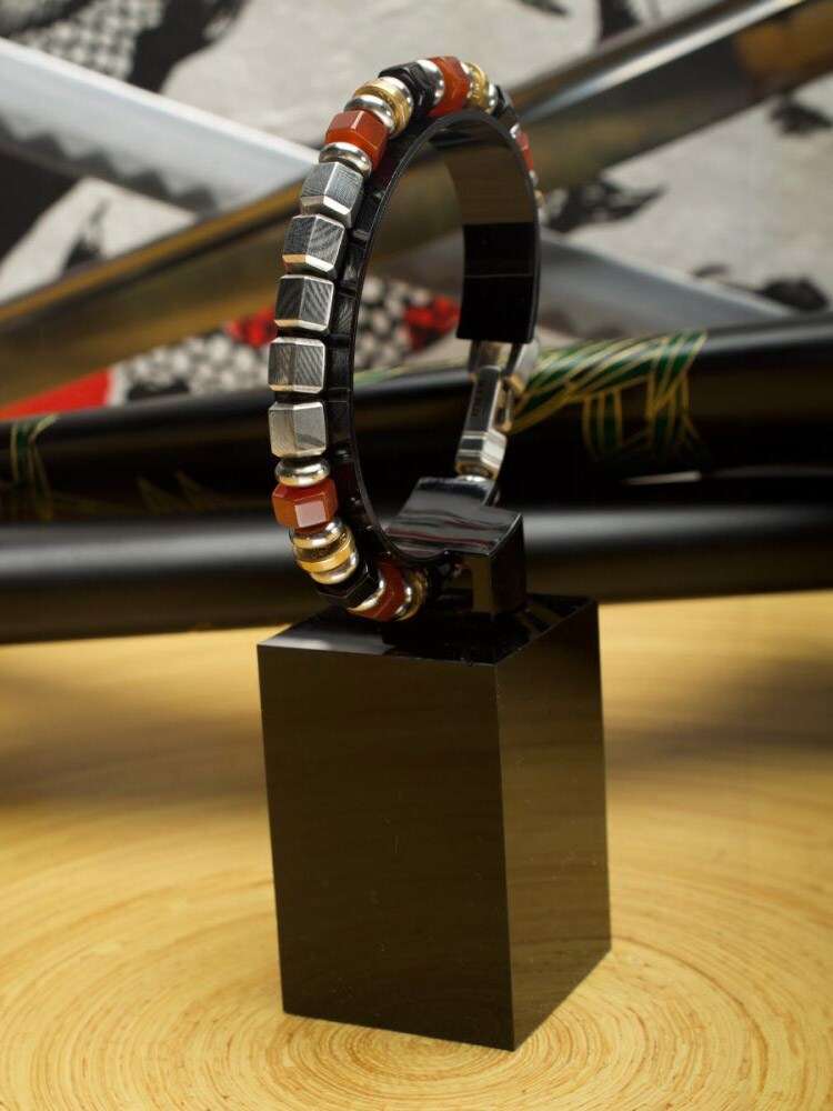 Et eksklusivt armbånd inspireret af den japanske Bushido-tradition. Armbåndet kombinerer den traditionelle teknik Mokume Gane – en unik metallkunst, der skaber mønstre, som minder om træårer – med smukke ædelstene.