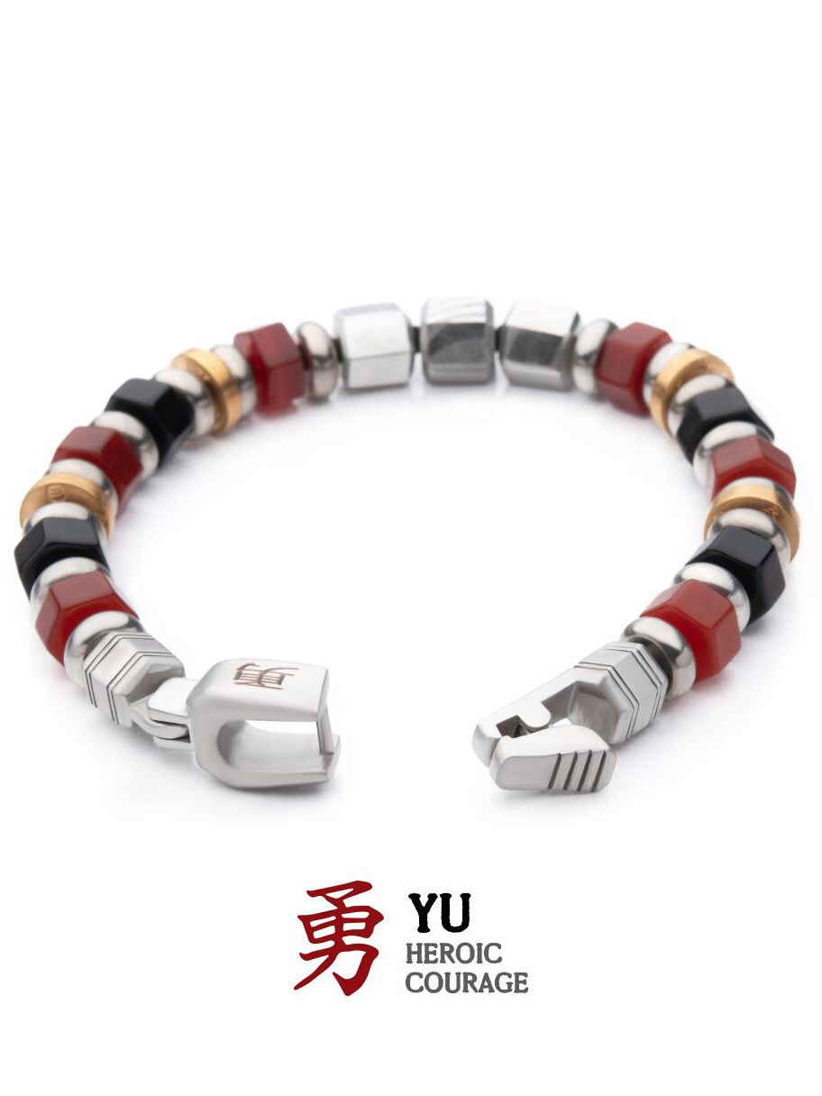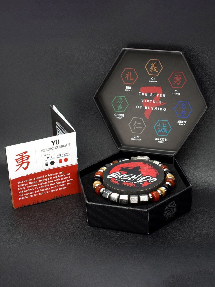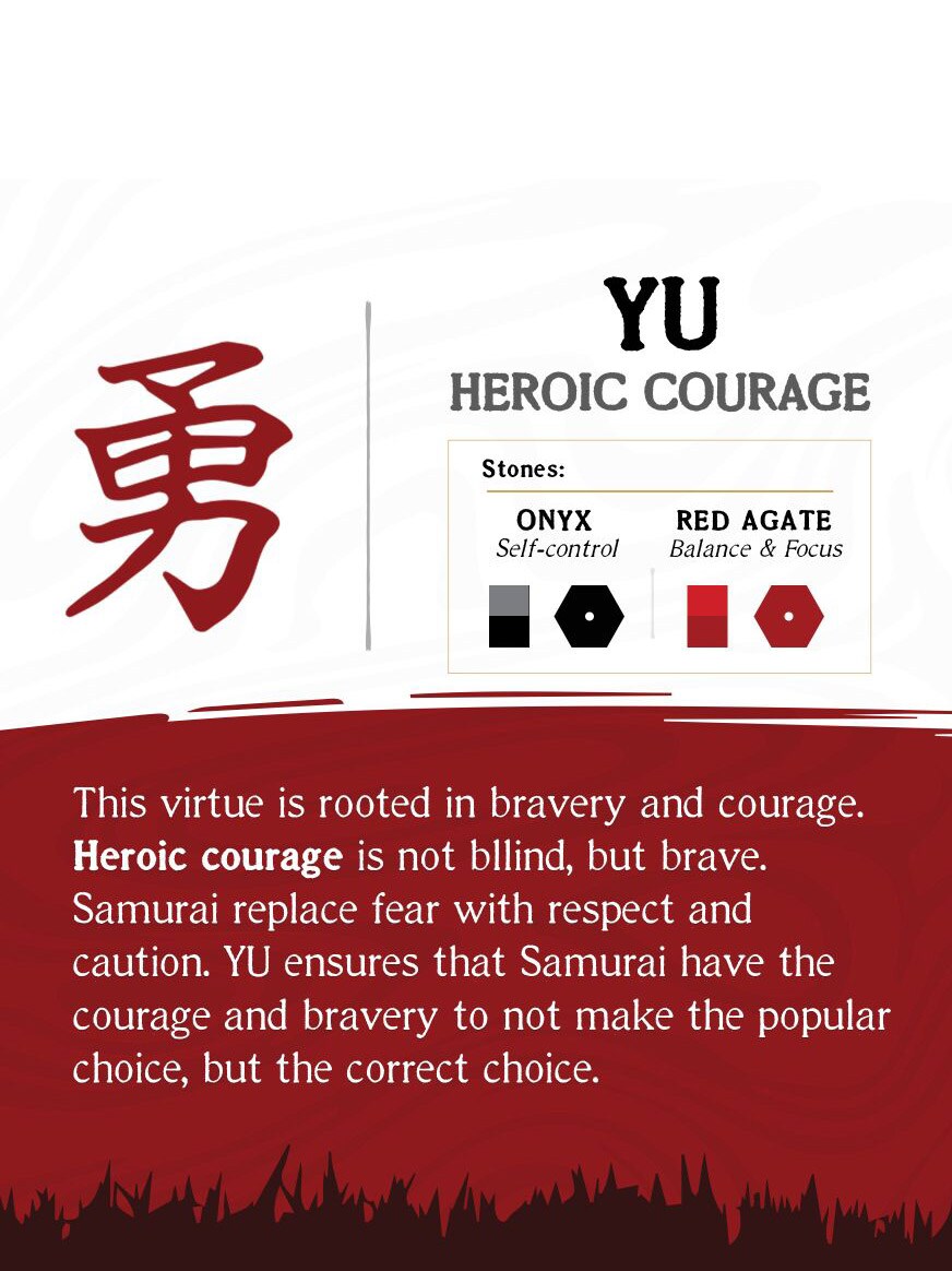 YU: HEROIC COURAGE – Denne dyd er rodfæstet i mod og tapperhed. Heltens mod er ikke blindt – men bevidst. Samuraien erstatter frygt med respekt og forsigtighed. YU giver samuraien styrken til at vælge det rigtige, ikke det populære.