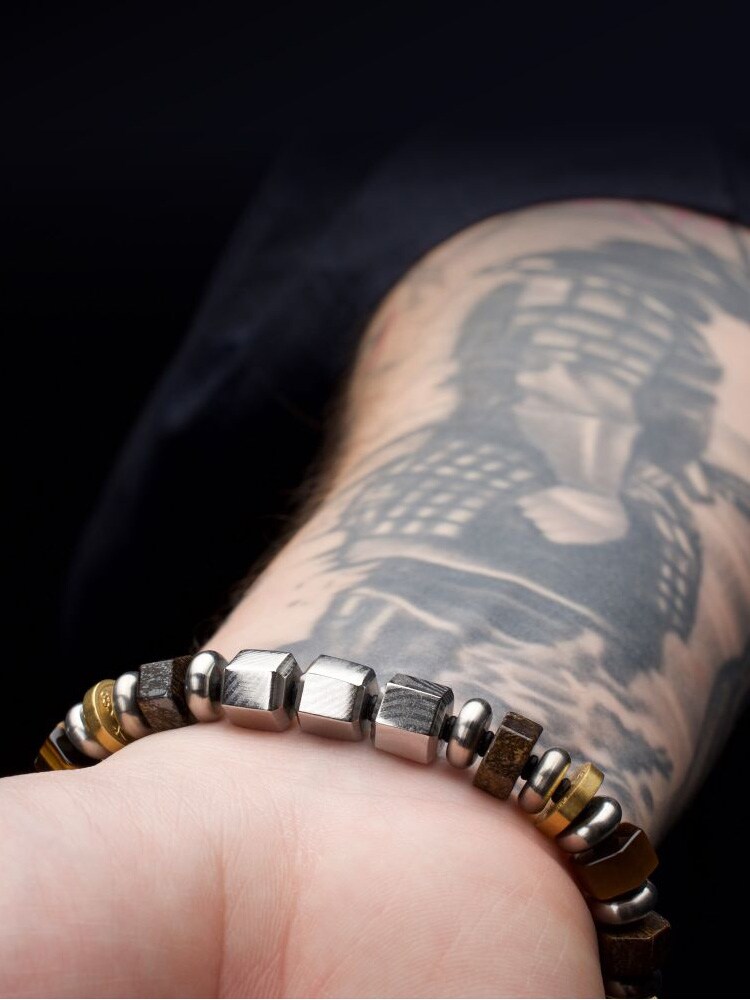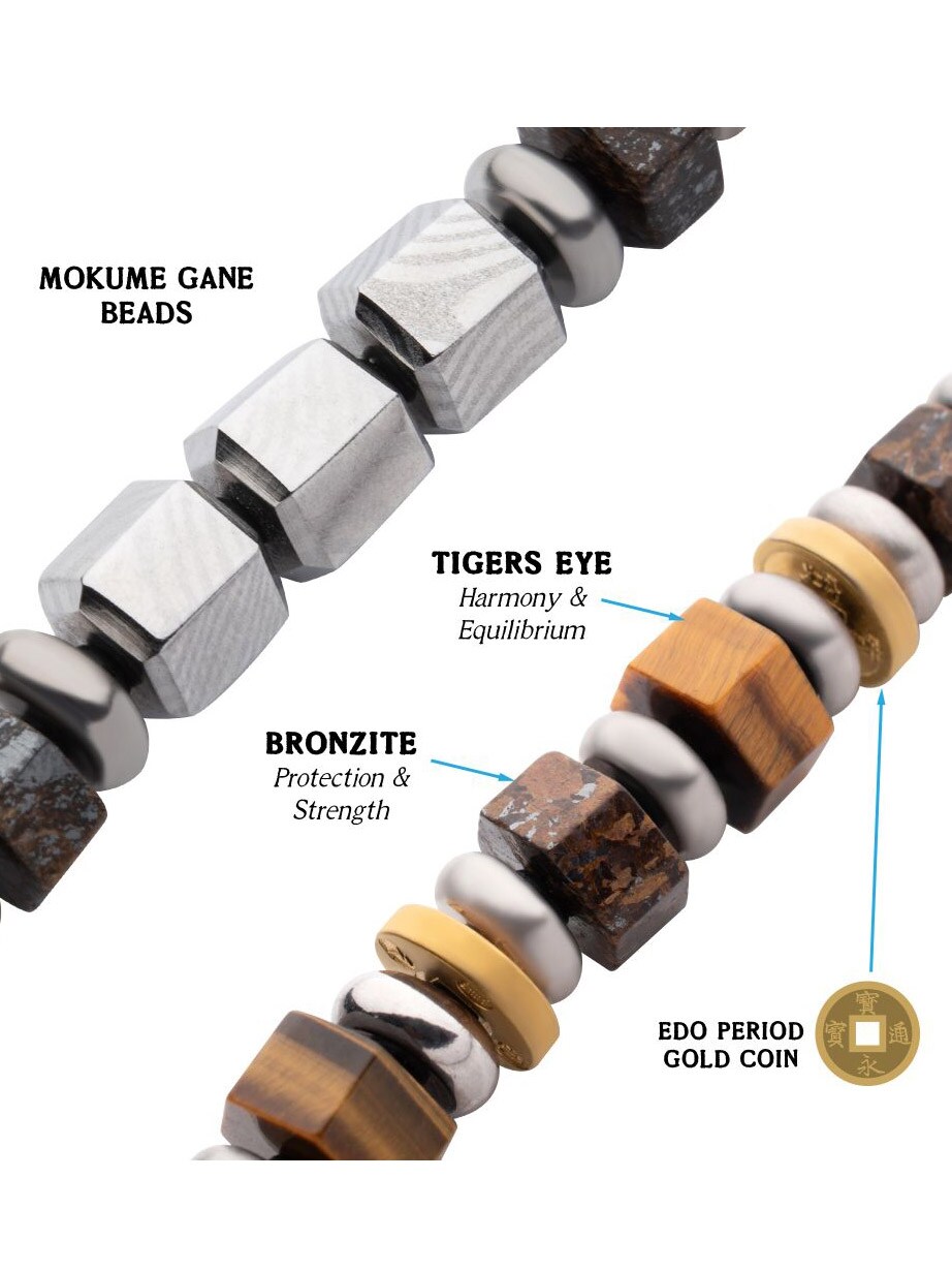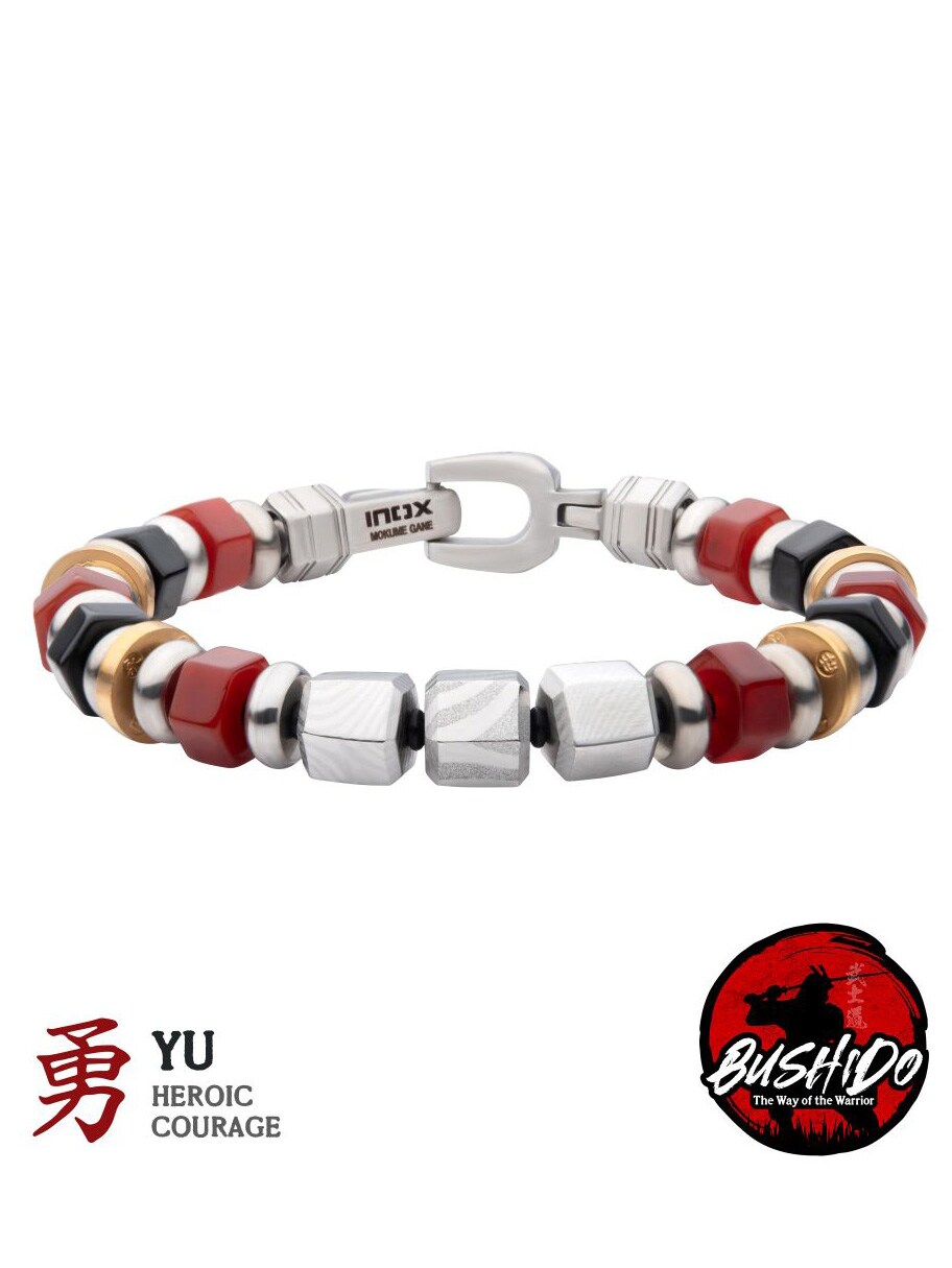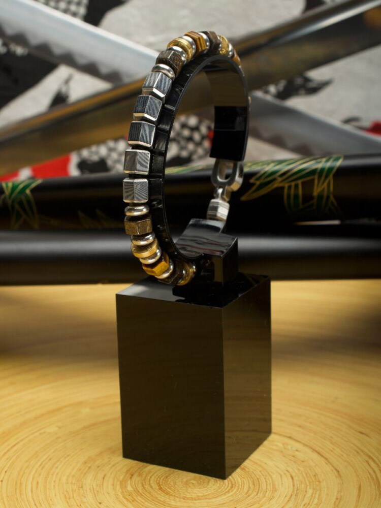 Et eksklusivt armbånd inspireret af den japanske Bushido-tradition. Armbåndet kombinerer den traditionelle teknik Mokume Gane – en unik metallkunst, der skaber mønstre, som minder om træårer – med smukke ædelstene.