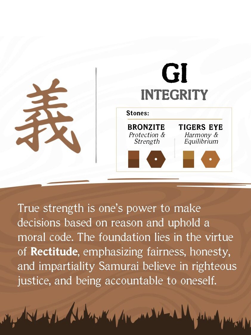 GI: INTEGRITY – Den sande styrke ligger i evnen til at træffe beslutninger baseret på fornuft og at følge en moralsk kodeks. Grundlaget findes i dyden Retfærdighed, som fremhæver fairness, ærlighed og upartiskhed. Samuraien tror på retfærdig dom og ansvar over for sig selv.