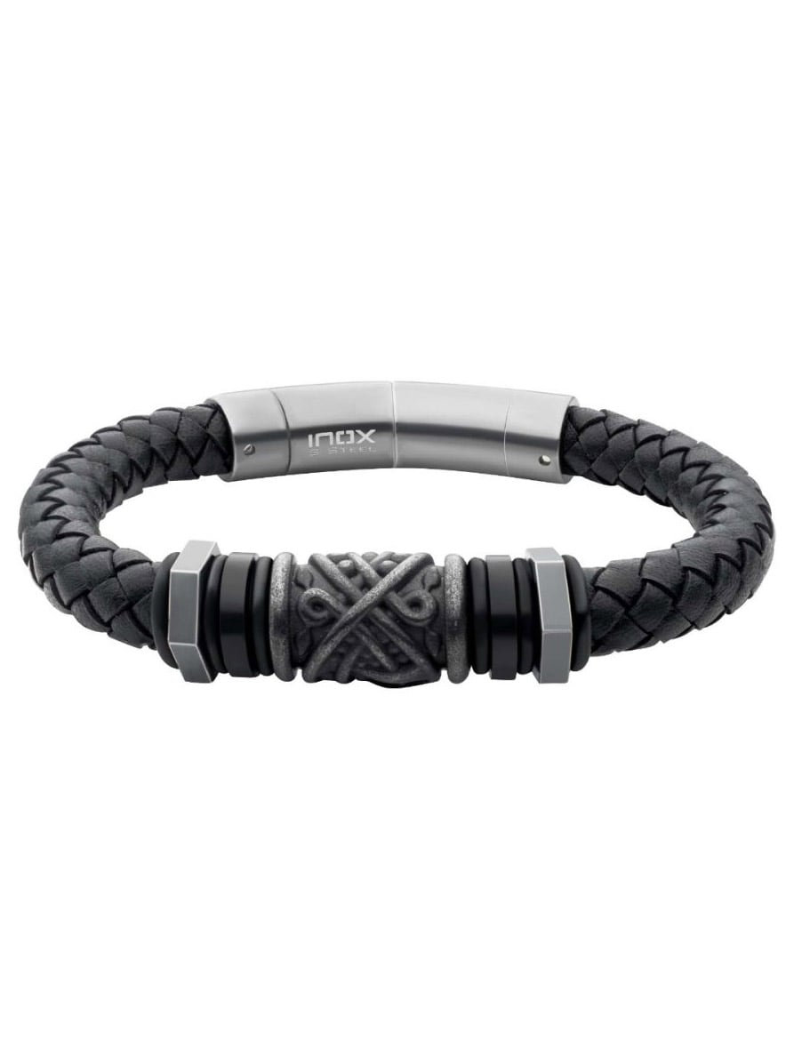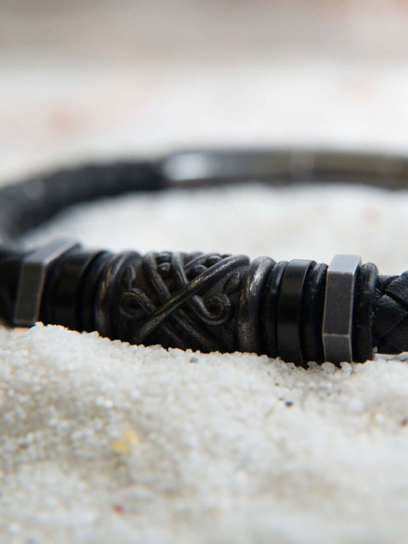 Maskulint armbånd i sort full grain koskind med flettet design og gunmetal-farvede detaljer. Udstyret med en praktisk, rørformet tryklås for sikker og nem lukning. Et perfekt valg af accessory til dig, der ønsker noget diskret, men alligevel karakterfuldt.