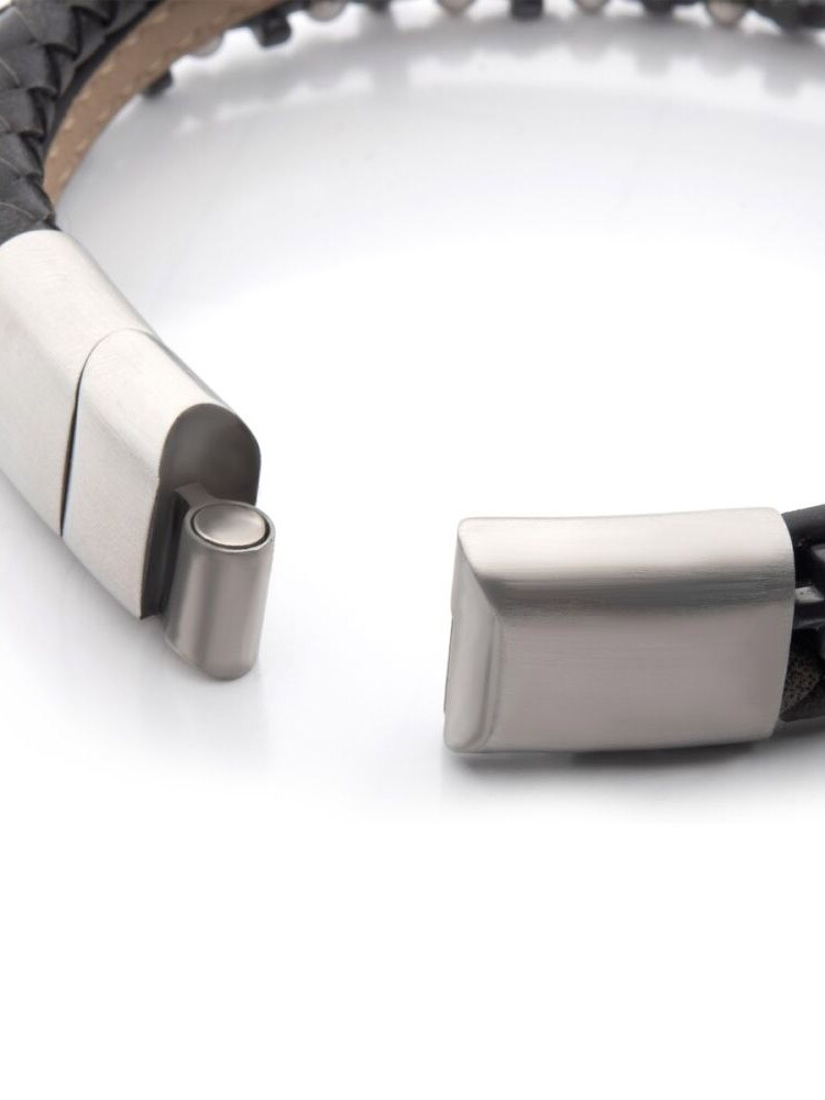 Multistrenget armbånd i denimblåt, sort og brunt full grain-kolæder, kombineret med hæmatitperler formet som små kors. Armbåndet har en magnetisk stållås og et ekstra justerbart led for optimal pasform. Et moderne accessory med både karakter og detaljer, der skiller sig ud.