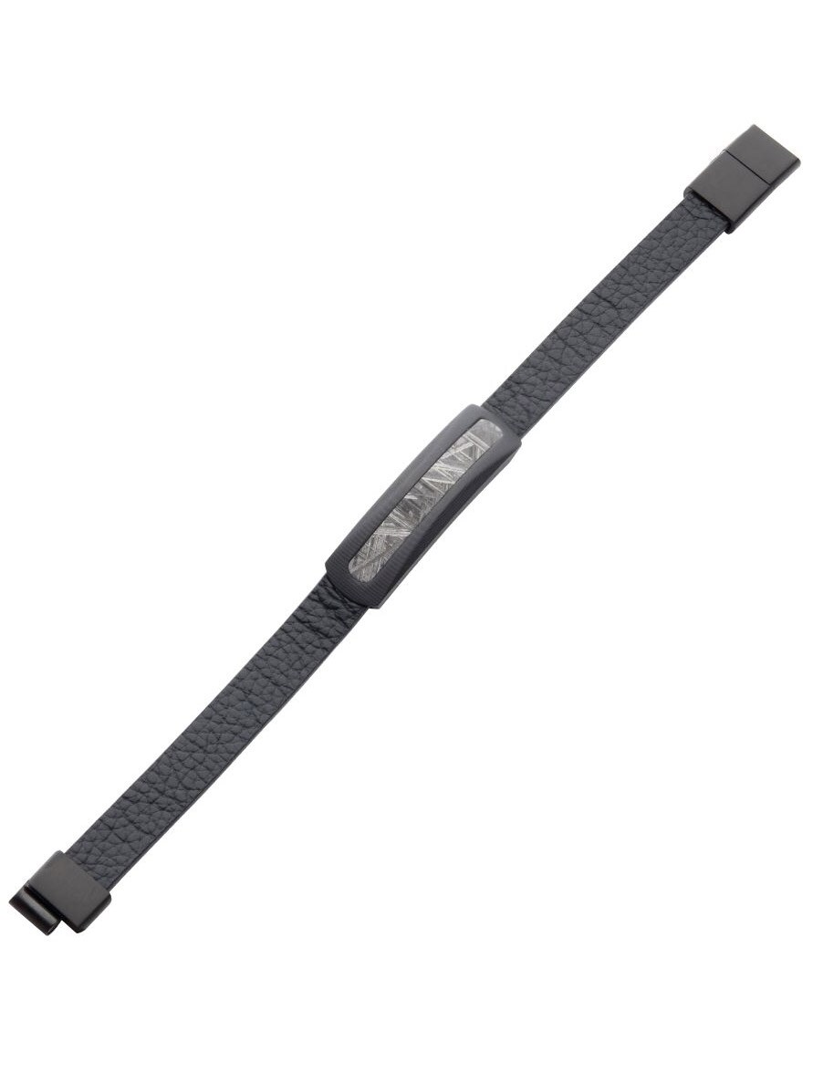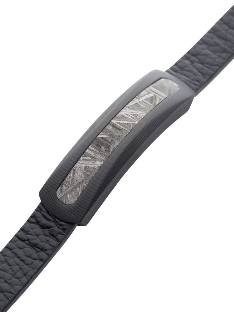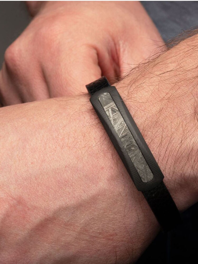 Unikt armbånd i sort præget læder med eksklusive kulstofdetaljer og ægte meteoritindlæg. Udstyret med en justerbar magnetlås i rustfrit stål for nem og sikker brug.