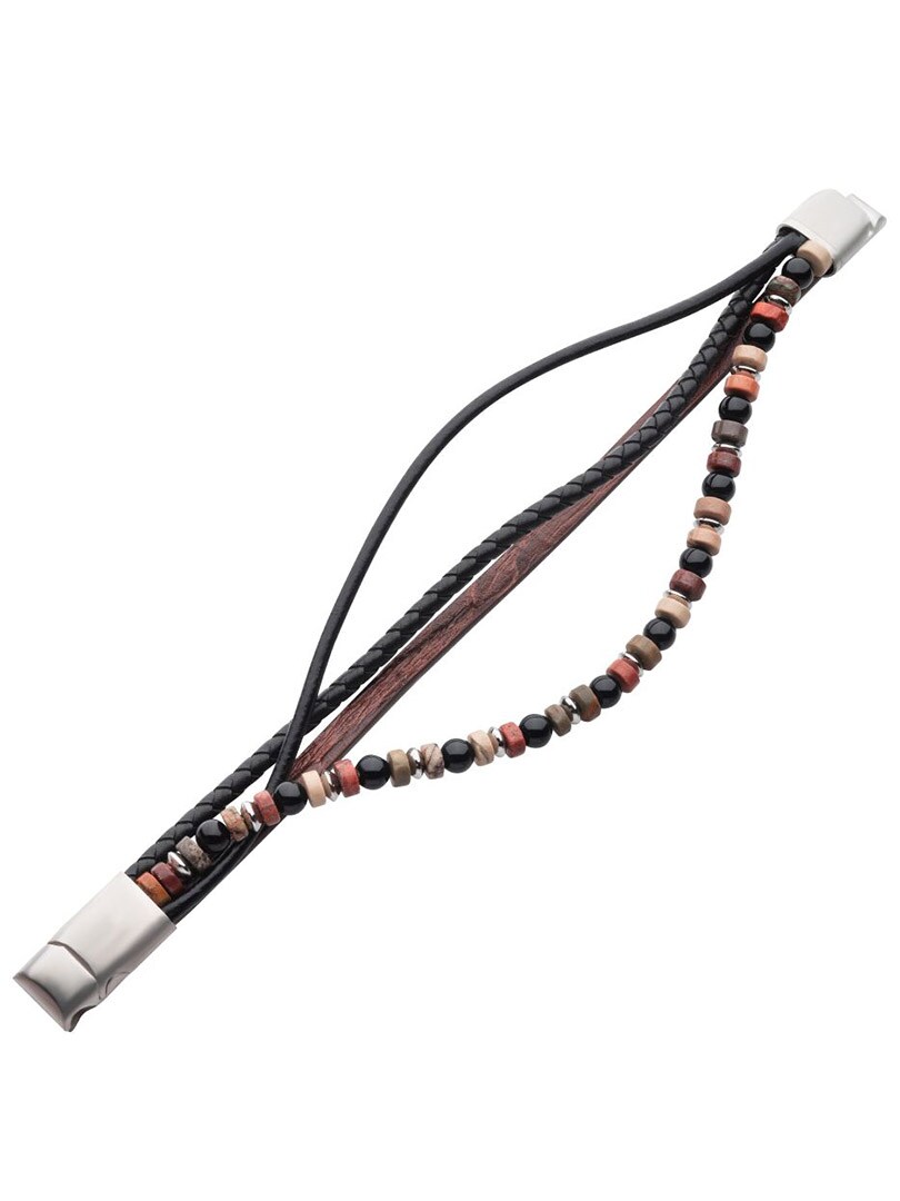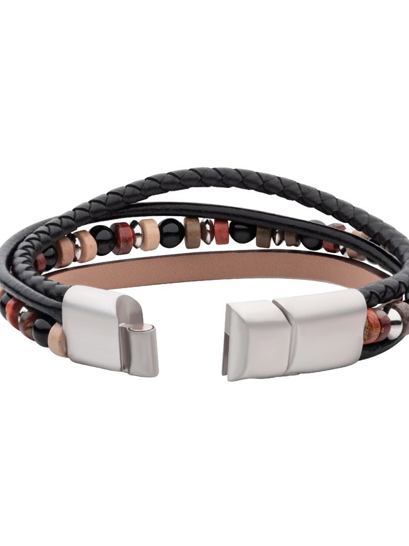 Stilfuldt multistrenget armbånd i full grain-kolæder, kombineret med perler af sort onyx og bloodstone for et naturligt og kraftfuldt look. Armbåndet har en magnetisk stållås samt et ekstra justerbart led for fleksibel pasform. Et perfekt accessory til dig, der ønsker en moderne blanding af læder og ædelstensdetaljer.