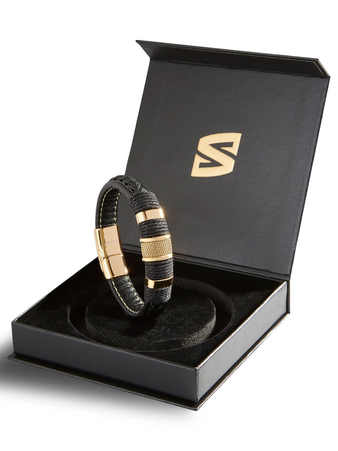 Et kraftfuldt armbånd, der kombinerer flettet læder med detaljer i rustfrit stål for et moderne og robust look. Låsen er let at betjene med én hånd, og armbåndet leveres med en ekstra forlængerlænke, så du nemt kan justere længden til den ønskede pasform. Et stilfuldt accessory, der løfter enhver outfit.