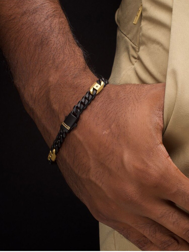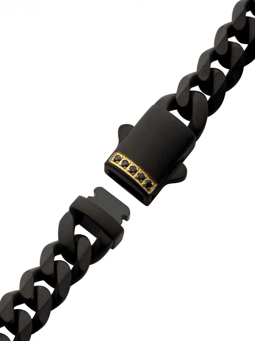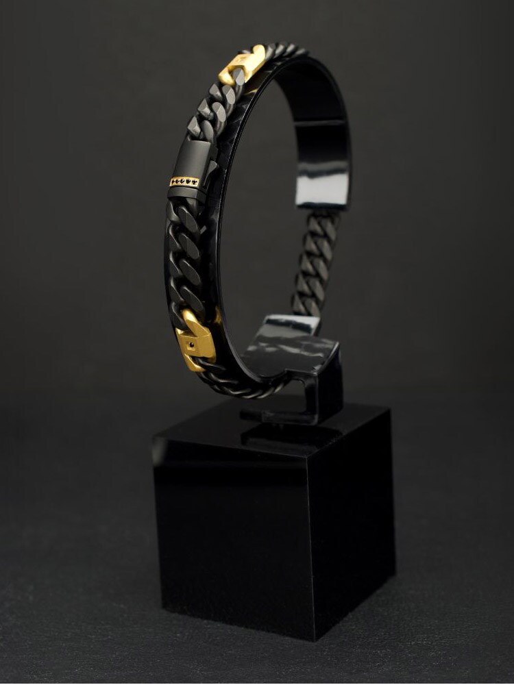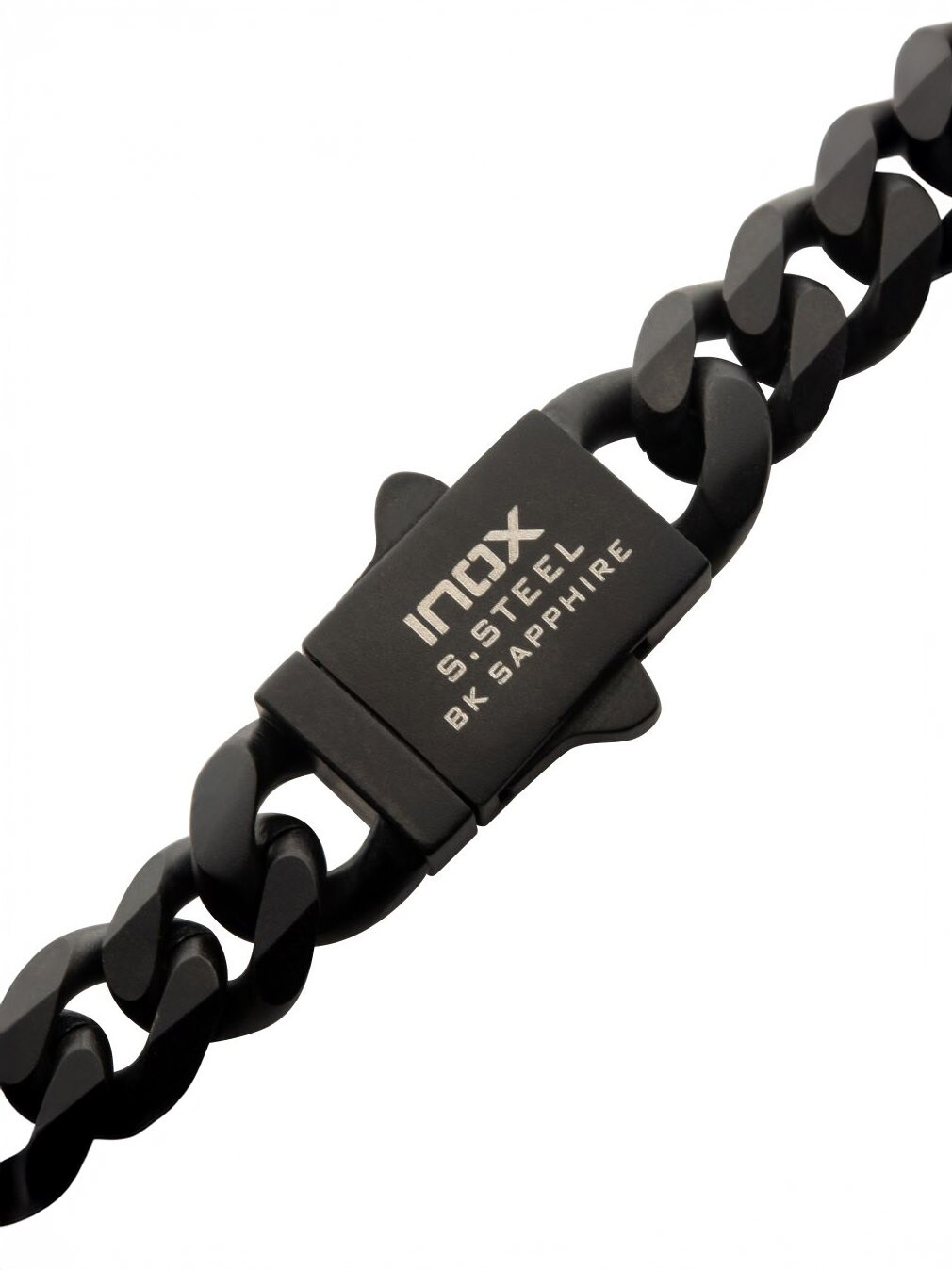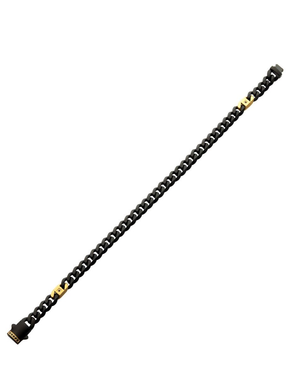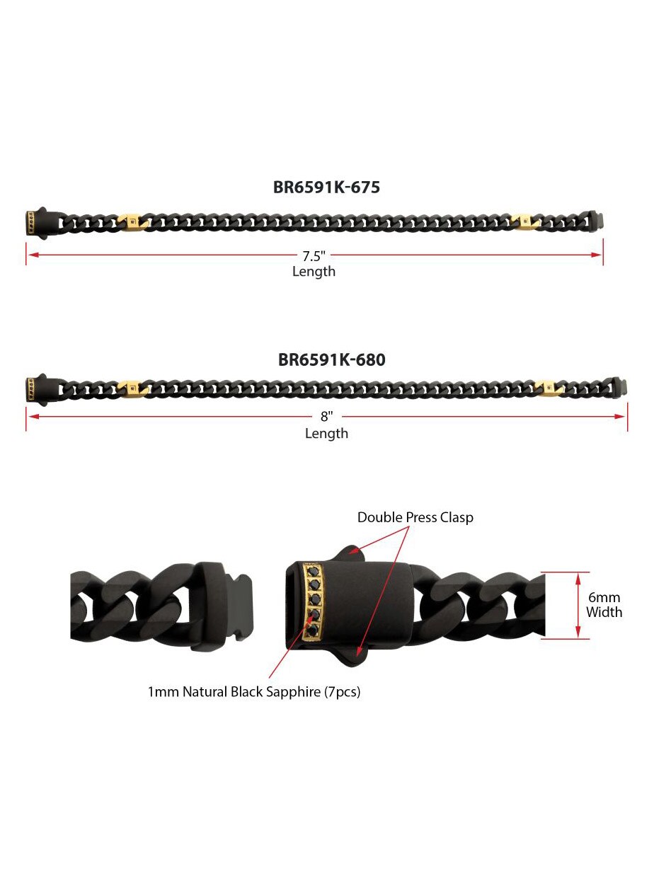 Kædearmbånd i rustfrit stål med sort IP-belægning og gulddetaljer. Designet med en safirsten ved låsen og mat finish.
