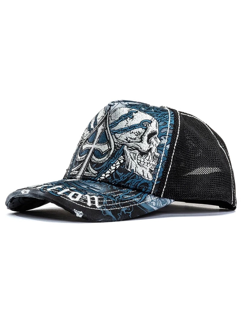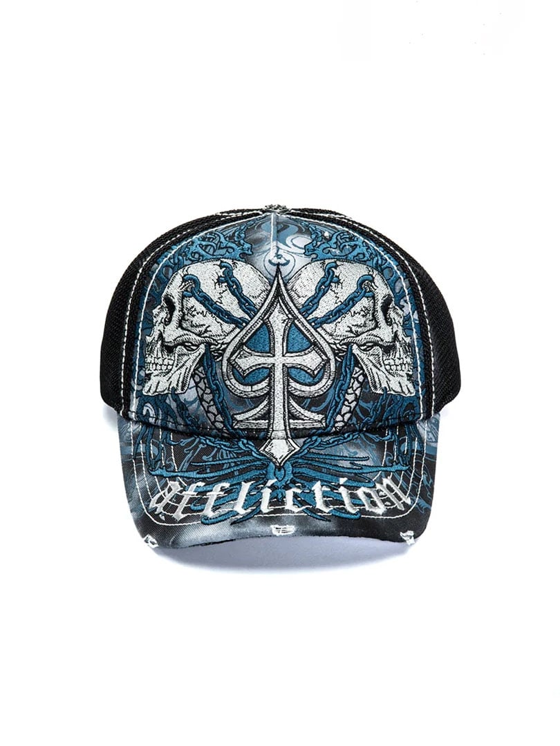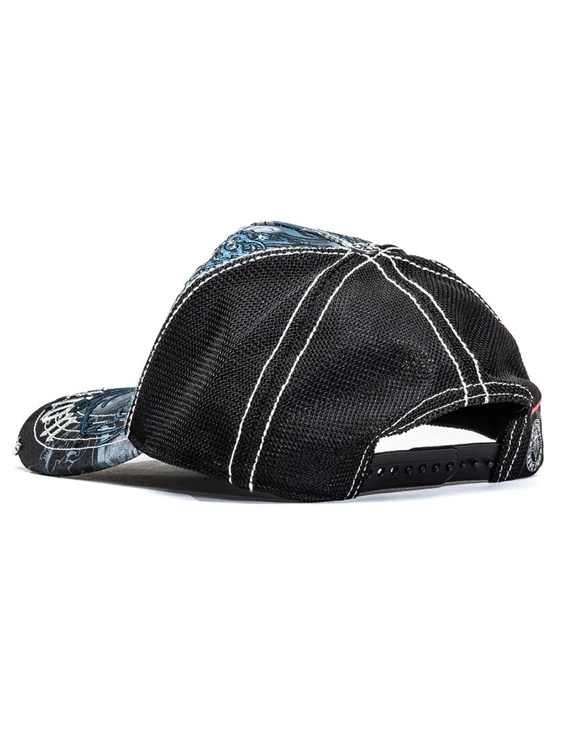 En truckerkasket med et kraftfuldt og detaljeret udtryk i Afflictions karakteristiske stil. Kasketten har twill foran og på skyggen samt mesh bagpå for god ventilation. Slidte detaljer på front og skygge kombineret med kontrastsyninger giver et råt og rockinspireret look. Snapback-lukning bagpå gør pasformen justerbar og behagelig til daglig brug.