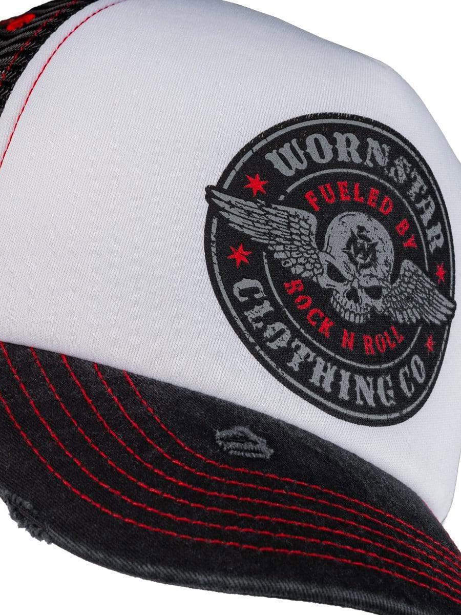 Wornstar Fueled Trucker Cap i sort og hvid med slidte detaljer er det ultimative valg for et rockigt look.
