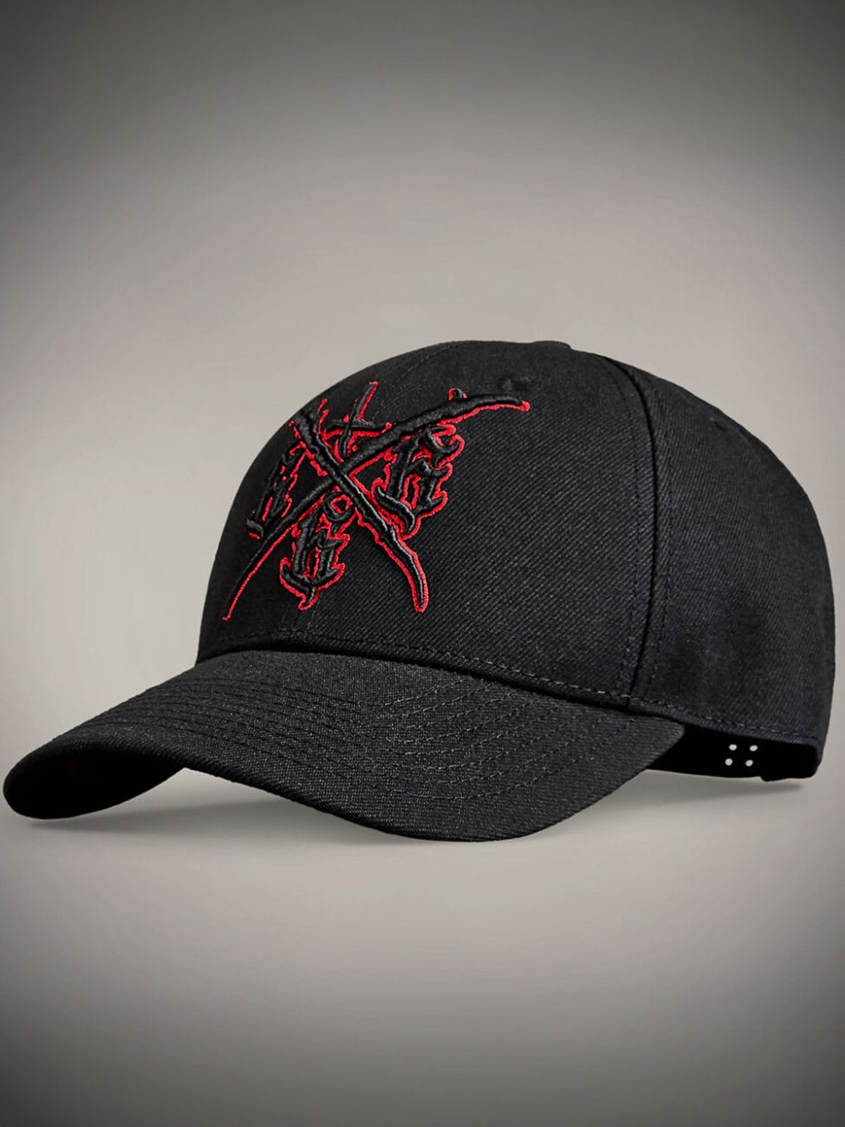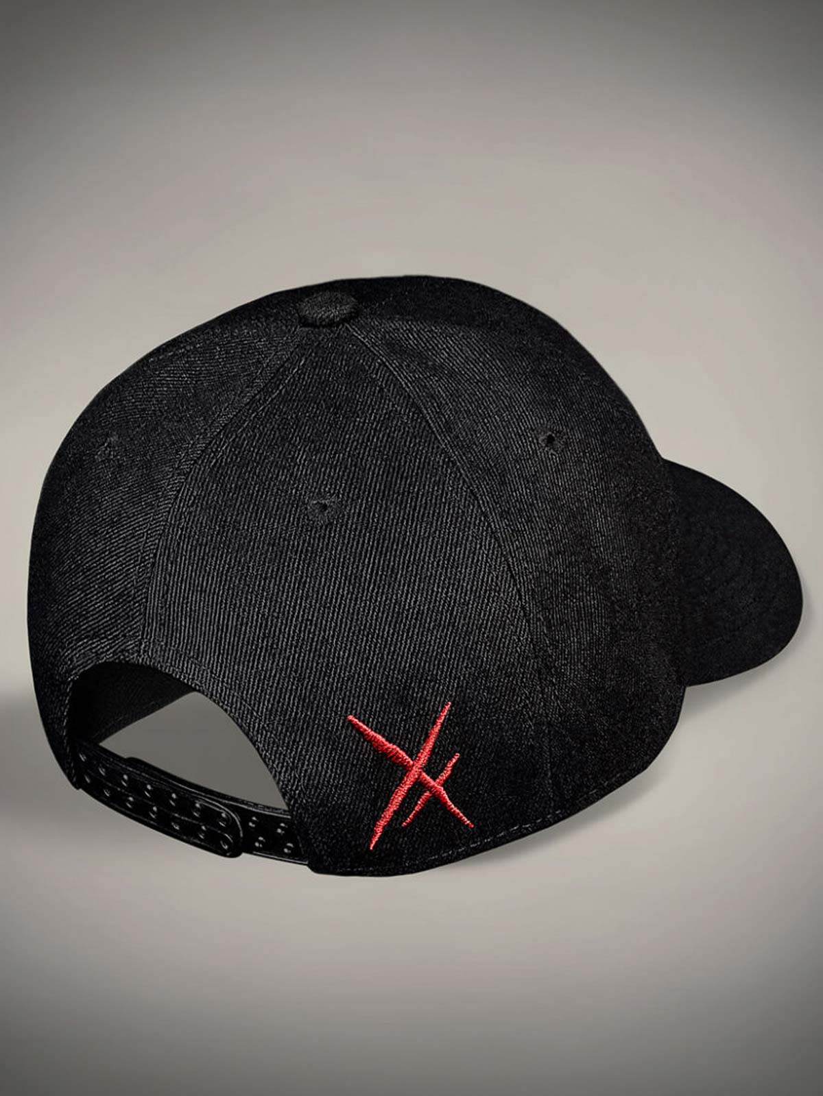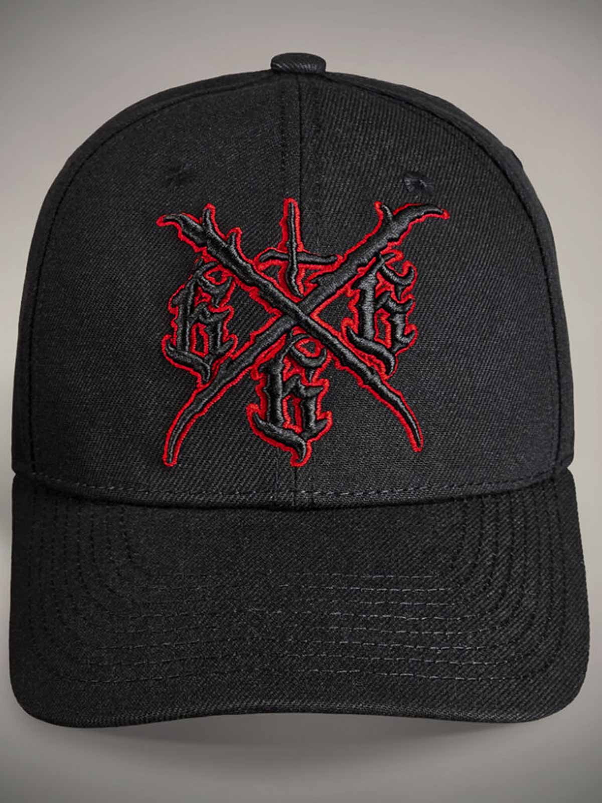 Sort kasket med råt, skræddersyet rødt tryk på skygens underside, broderet motiv foran og et lille rødt broderi bagpå. Kasketten har buet skygge og justerbar snapback for en behagelig pasform.